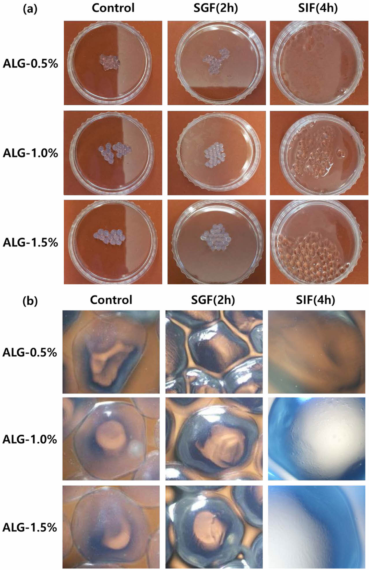 Changes in morphology of SGF and SIF based on alginate concentration.