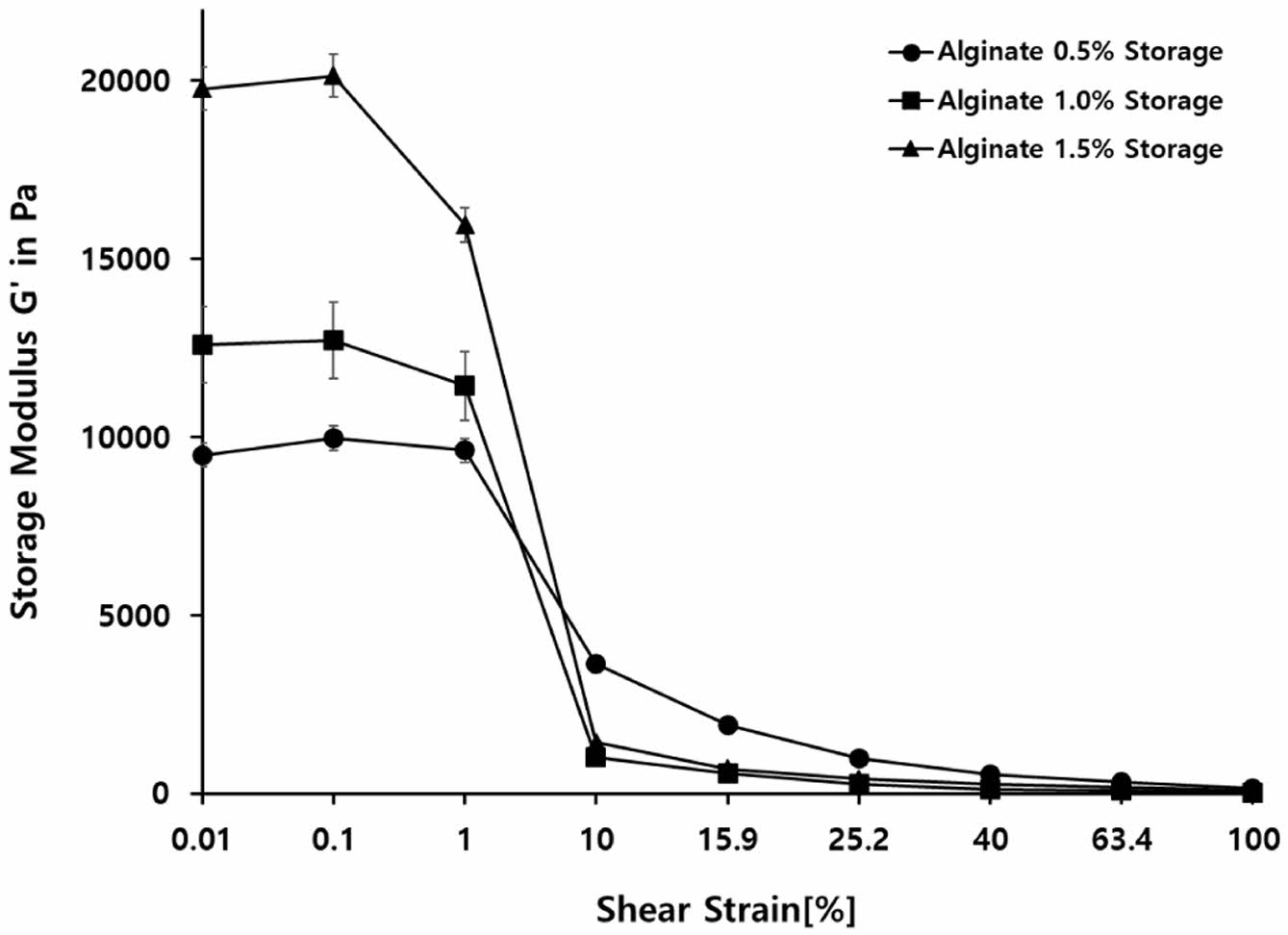 진폭 조절 스윕(Amplitude Sweep) 분석. 알긴산의 강도를 평가하기 위해 각각 0.5%, 1.0%, 1.5% 농도로 제조된 알긴산 캡슐을 준비하고, 위액(pH 1.2)조건에서 2시간 동안 처리하고 위액에서의 강도를 평가하였다. 장액에서의 강도 평가는 앞서 언급한 방법과 같이 위액 100 mL에서 2시간 동안 처리한 후 회수하고, 37 ℃로 설정된 shaking incubator에서 100 rpm으로 장액(pH 6.8) 100 mL에서 4시간을 추가로 침지하여 측정하였다. 진폭 조절 스윕(amplitude sweep)으로 강도 평가를 위해 레오미터 MCR302(Anton Paar)장비에 PP25 Parallel Plate을 사용하였다. frequency(f)는 1 Hz이며, 변형률(shear strain, g)은 0.01%에서 100%까지 로그 스케일로 변화시키며 총 21개의 포인트로 데이터를 수집하였다.16