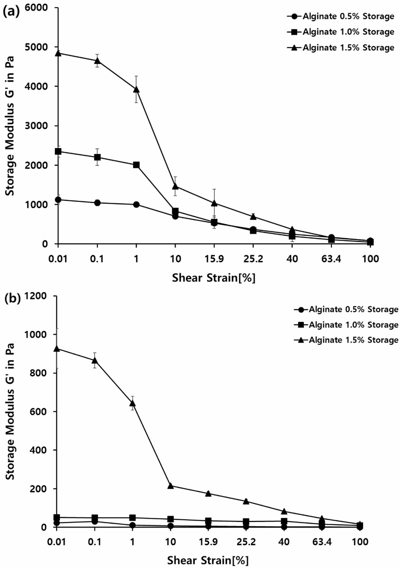 Amplitude sweep changes of alginate capsules: (a) SGF on 2 h; (b) SIF on 4 h.