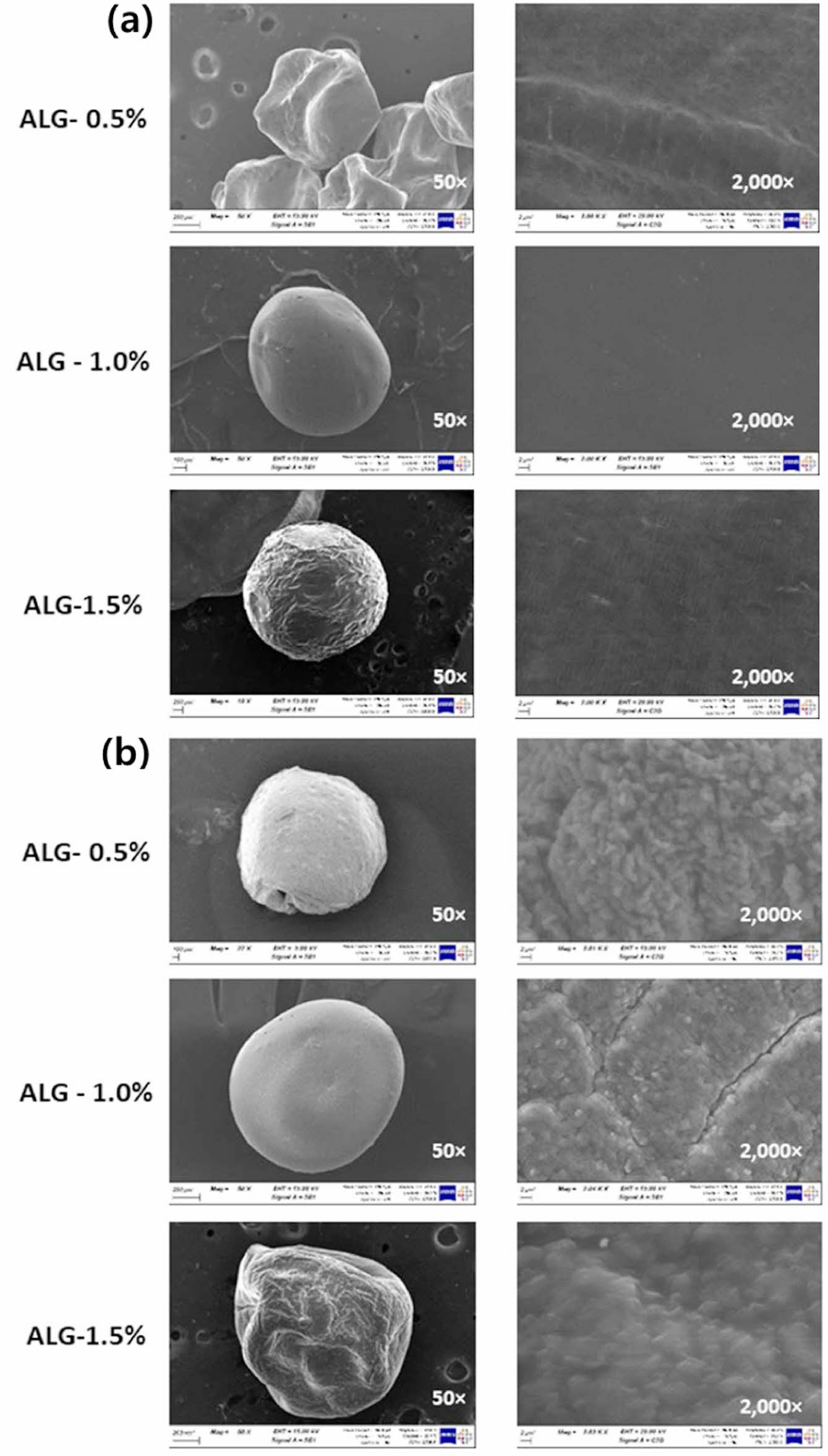 Using a scanning electron microscope (SEM) to observe the surface of alginate capsules: (a) alginate capsule; (b) algiante capsule in L. salivarius.