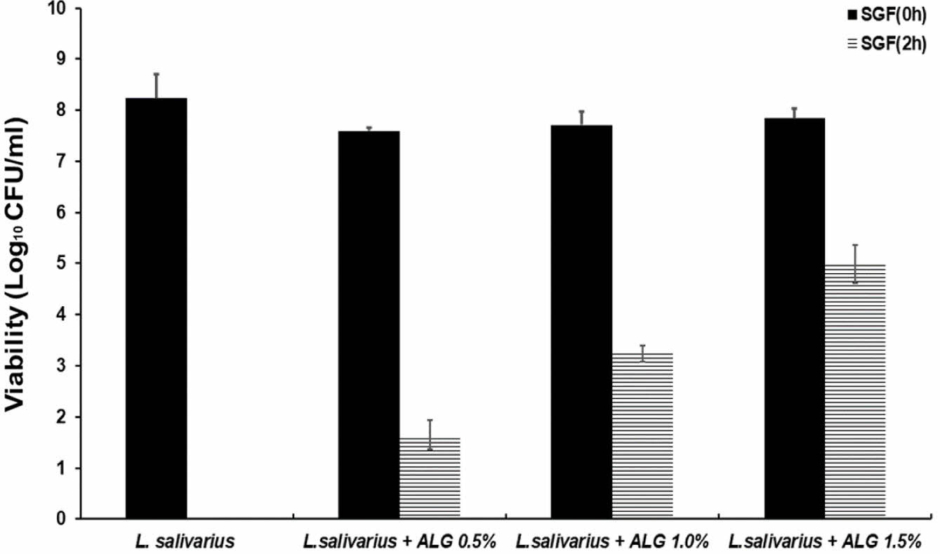 Lactic acid bacteria play a vital role in enhancing the immune system by maintaining intestinal microbiota balance. However, their effectiveness is limited due to reduced survival during gastrointestinal transit. In this study, we prepared the 0.5%, 1%, and 1.5% concentrations of alginate-based capsules mixed with Lactobacillus salivarius (L. salivarius) and evaluated their survival rate in simulated gastric and intestinal fluid environments. Initially, the capsules showed viscoelastic strength values of 3864.0, 4762.8, and 6871.0. However, after 2 hours of exposure in simulated gastric fluid, these values declined to 869.2, 1431.3, and 2889.1. Subsequent exposure for 4 hours in simulated intestinal fluid further decreased the strengths to 238.1, 342.6, and 831.1. L. salivarius were encapsulated within each type of alginate capsule, encapsulation efficiencies were measured as 93%, 95%, and 96%. The survival rates of L. salivarius after 2 hours in gastric juice were 22%, 42%, and 64%, with the 1.5% alginate capsule showing the highest survival rate. In intestinal juice, the survival rate of L. salivarius encapsulated in 1.5% alginate capsules was 47%. These findings demonstrate that L. salivarius survival improves with increased alginate concentration; however, achieving high lactic acid bacteria survival rates is limited when using alginate alone.