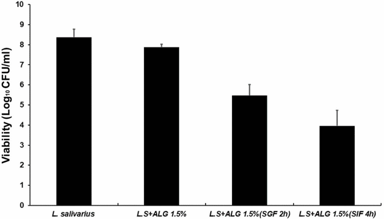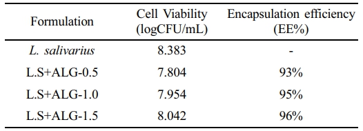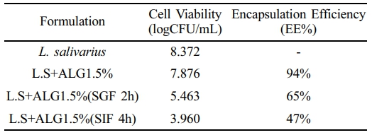 L. salivarius에서 생성되는 박테리오신은 Entero coccus faecalis, Clostridium perfringens, Helico bacter pylori와 같은 병원성 박테리아의 성장을 억제하는 항균 물질을 만드는 것으로 보고되어 있다.12,13 L. salivarius 특징으로는 염증성 사이토카인의 분비가 감소하고 IL-10생성이 급격히 증가하여 점막 림프 조직에서 면역 반응의 생리적 활성을 유지하는데 면역 조절 활성을 갖고, 간손상을 완화하는데 효과를 갖는다.14,15 하지만 캡슐화되지 않은 L. salivarius의 경우, 위액 조건에서는 초기 20분 이내에 약 2.4 logCFU/mL의 생존율 감소가 관찰되었다.14 따라서, L. salivarius가 위산에 대한 내산성이 부족하다는 것으로 보여주며, 장내 생존율을 높이기 위해 위산으로부터 효과적으로 보호할 수 있는 보호제를 필요로 한다.