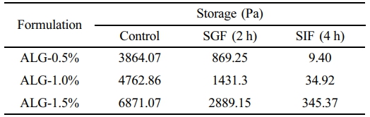 위장액에서의 Alginate 캡슐 강도 변화. 0.5, 1, 1.5% 농도의 알긴산 캡슐을 위장액에 노출 후 레오미터로 강도 측정하였고, 앞선 실험과 같이 저장탄성률의 수치를 평균화하여 측정하였다(Figure 6). 위액 조건에서 알긴산 0.5%는 869.25이고, 알긴산 1%는 1431.3, 알긴산 1.5%는 2889.15로 나타났다(Figure 6(a)). 반면, 장액에서 알긴산 0.5%는 9.40이고, 알긴산 1%는 34.92, 알긴산 1.5%는 345.37로 나타났다(Figure 6(b)). 따라서, 알긴산의 농도가 높을수록 강도가 높아지고, 안정적인 캡슐 구조를 갖는다고 판단된다. 또한, 위산 환경에서 알긴산 캡슐의 강도가 유지됨을 확인할 수 있었다. 반면, 위액과 달리 장액에서는 저장탄성률이 크게 떨어지며, 강도가 약해짐을 확인하였다(Table 1).