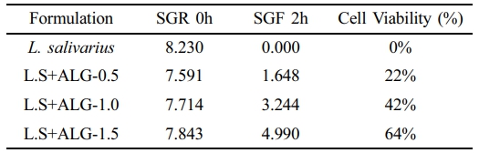 • 알긴산 캡슐의 농도에 따른 위장관에서의 Lactobacillus salivarius 생존율 평가