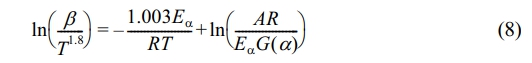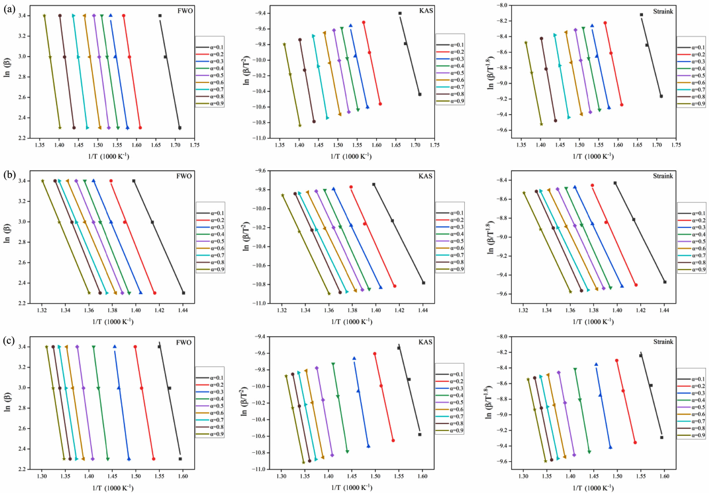 Equations (6) to (8) utilize 1/T as the horizontal axis, while ln(β), ln(β/T 2), and ln(β/T1.8) are employed as the vertical axes for the purpose of curve fitting. The slopes of these fitted curves are then analyzed to estimate the activation energy (Eα) at various conversion rates.