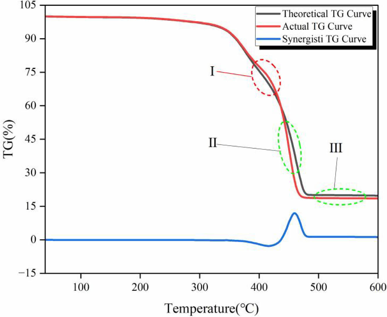 Theoretical TG Curve Method: The presence of a synergistic impact during the co-pyrolysis process may be ascertained using the theoretical TG curve approach. The following is the expression for the theoretical TG curve approach:32