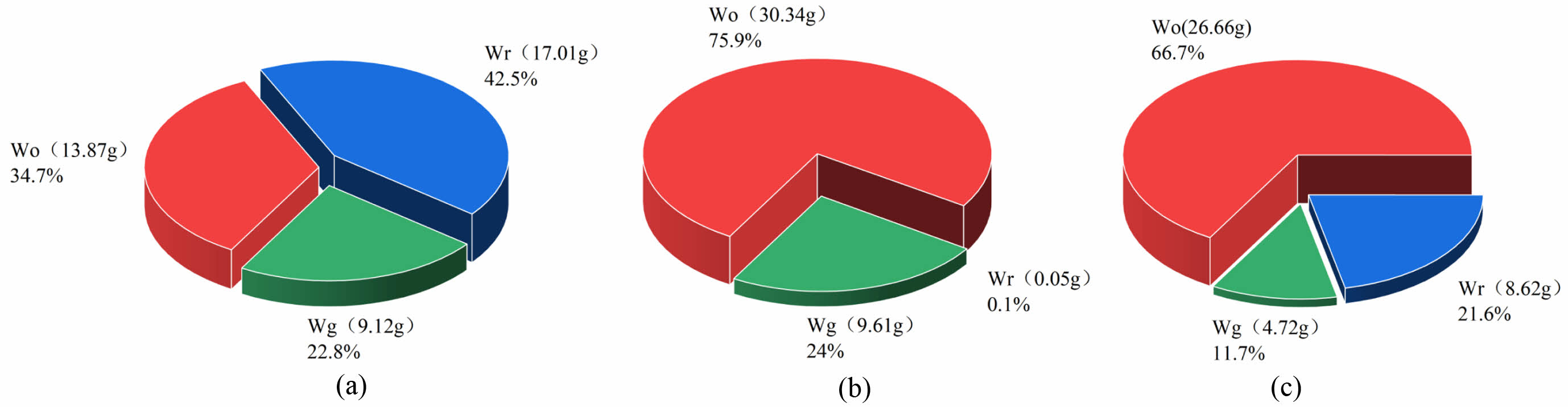 The composition ratio of pyrolysis products: WPp (a); WTs (b) and WTs/WPp. Note: Wz represents total mass, Wo represents quality of pyrolysis oil, Wr represents quality of pyrolysi residue, Wg represents quality of pyrolysis gas.