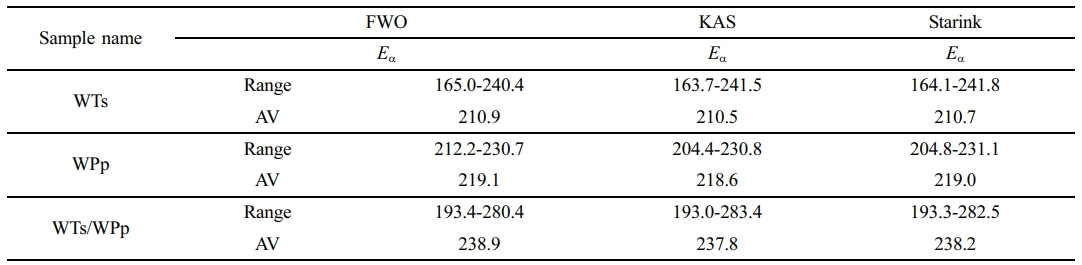 (2) Three model-free techniques were used for the calculations, and the outcomes consistently demonstrated that the real average activation energy in WTs/WPp co-pyrolysis was larger than that in WPp and WTs pyrolysis.