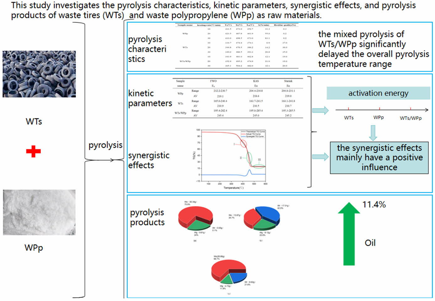 In this thesis, with the aid of a thermogravimetric analyzer, the individual pyrolysis of WTs and WPp as well as the co-pyrolysis of WTs/WPp were comprehensively and thoroughly analyzed, focusing on the pyrolysis characteristics, kinetic parameters, synergistic effects, and the distribution patterns of the pyrolysis products (solid, liquid, and gaseous) of these processes, and based on which, the following deductions were made: