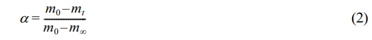 The equation above represents the conversion rate α, where m0 denotes the initial mass of the specimen, measured in milligrams, mₜ refers to the transient mass at the specified thermal condition, and m signifies the asymptotic residual mass upon completion of the process.
