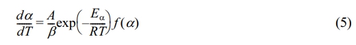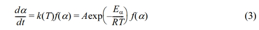 The rate of reaction, /dt, is governed by the reaction rate constant k(T) and the function f(α), which describes the thermal decomposition mechanism. The correlation between k(T) and the temperature T is given by the Arrhenius equation: