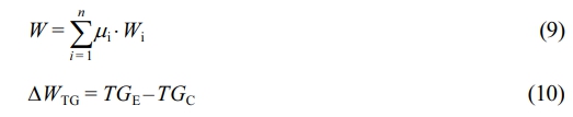 In Equation (9), μi denotes the fraction of the total mass corresponding to a single sample, given in weight percent (wt%). Wi denotes the thermal degradation TG of an individual test sample. In this context, TGE refers to the theoretical TG curve, while TGC signifies the actual TG curve. The difference between the theoretical and real TG curves is denoted by the term DWTG.
