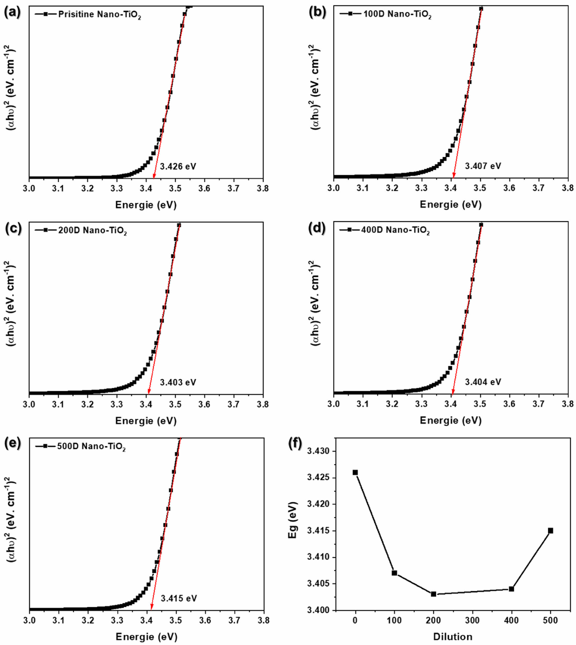 (a) Pristine; (b) 100D; (c) 200D; (d) 400D; (e) 500D for Tauc plot of PANi/phytic acid on Nano-TiO2 electrode; (f) Eg according to various diluted reaction solutions.