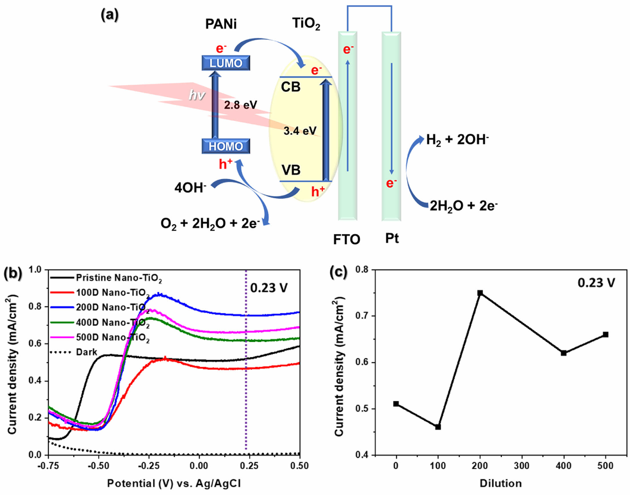 EC characterization of PANi/phytic acid on Nano-TiO2 electrodes prepared using various di-luted reaction solutions: (a) reaction route of UV-vis light absorption and charge transfer in PANi/phytic acid on Nano-TiO2 for photoelectrochemical water splitting; (b) I-V curves recorded at a scan rate of 10 mV/s under illumination (AM 1.5G, 100 mW/cm2); (c) current density at 0.23 V vs. Ag/AgCl.