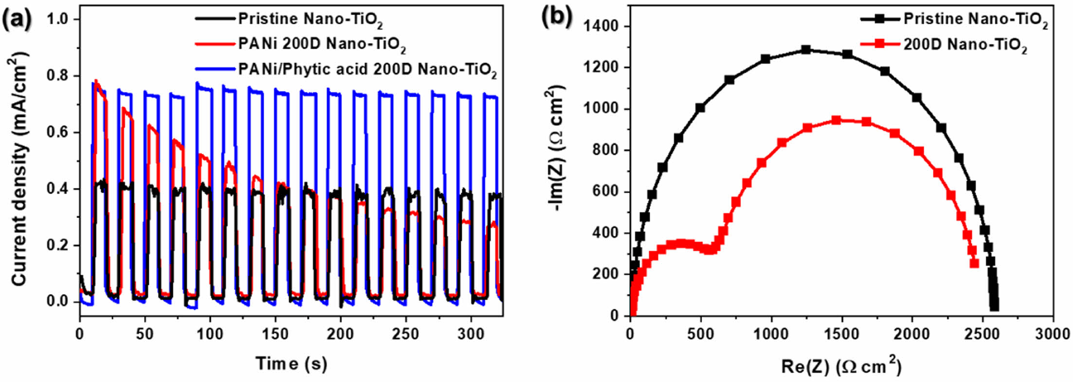 Among the prepared electrodes, the 200D Nano-TiO2 electrode exhibited the highest photocurrent density and superior cycling stability, which were attributed to its optimal PANi/phytic acid coverage. EIS further revealed a reduced interfacial charge transfer resistance in the 200D Nano-TiO2 electrode, underscoring its improved intrinsic conductivity and suppressed charge-carrier recombination.