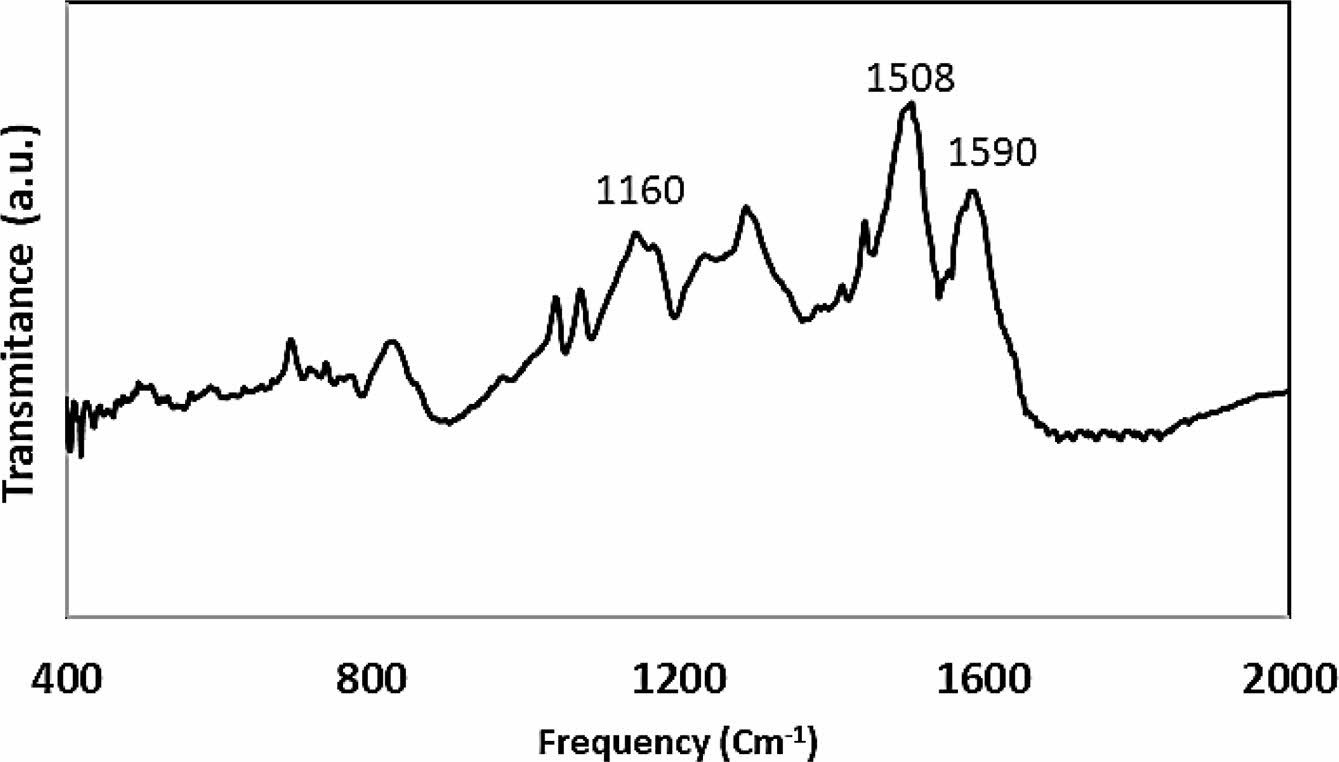 The FTIR spectrum of the synthesized PANI is presented in Figure 1. Two distinct peaks at 1508 and 1590 cm-1 correspond to the benzenoid and quinonoid moieties of PANI, which are essential for understanding its electronic structure and properties. A characteristic peak at 1160 cm-1, attributed to the C–H bending vibration of the quinonoid unit, further confirms the presence of this structural motif within the polymer framework.19-22 The quinonoid structure plays a pivotal role in the electrical conductivity of PANI and its ability to transition between oxidation states. Elemental analysis reveals a composition of 75.5% carbon (C), 9.3% hydrogen (H), and 15.2% nitrogen (N), which closely aligns with the expected stoichiometry of polyaniline synthesized via conventional methods. The observed atomic ratio of C:N (5.8:1) corroborates the anticipated molecular structure of PANI, indicating that the synthesis process likely followed standard oxidative polymerization pathways and preserved a balanced distribution of quinonoid and benzenoid units.23