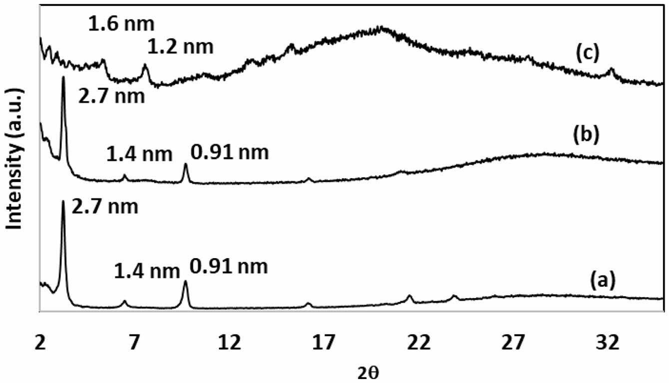 WAXS pattern of (a) Freeze-dried CTAB-LA coacervate gel; (b) freeze-dried PANI loaded CTAB-LA coacervate gel; (c) synthesized PANI into this matrice.
