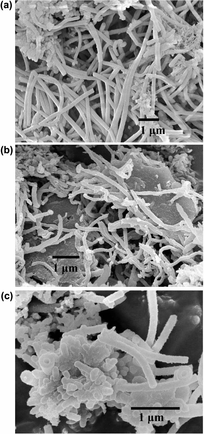SEM micrograph of polyaniline nanotube: (a) > 5 μm length; (b) ~ 2.4 μm length; (c) ~ 1 μm length.