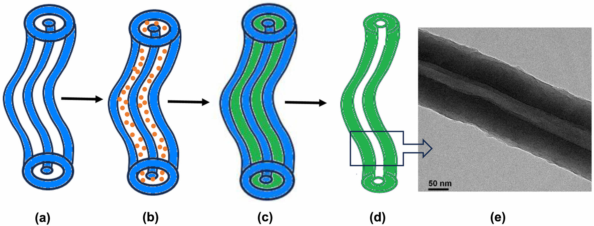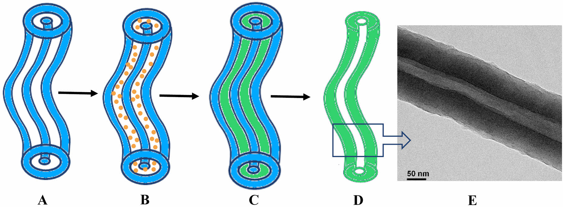 Schematic presentation of (A) CTAB-LA coacervate gel column (B) aniline loaded CTAB-LA coacervate gel column (C) synthesized polyaniline into CTAB-LA coacervate gel template (D) CTAB-LA coacervate gel template removed polyaniline nanotube. (E) TEM image of synthesized polyaniline nanotube.