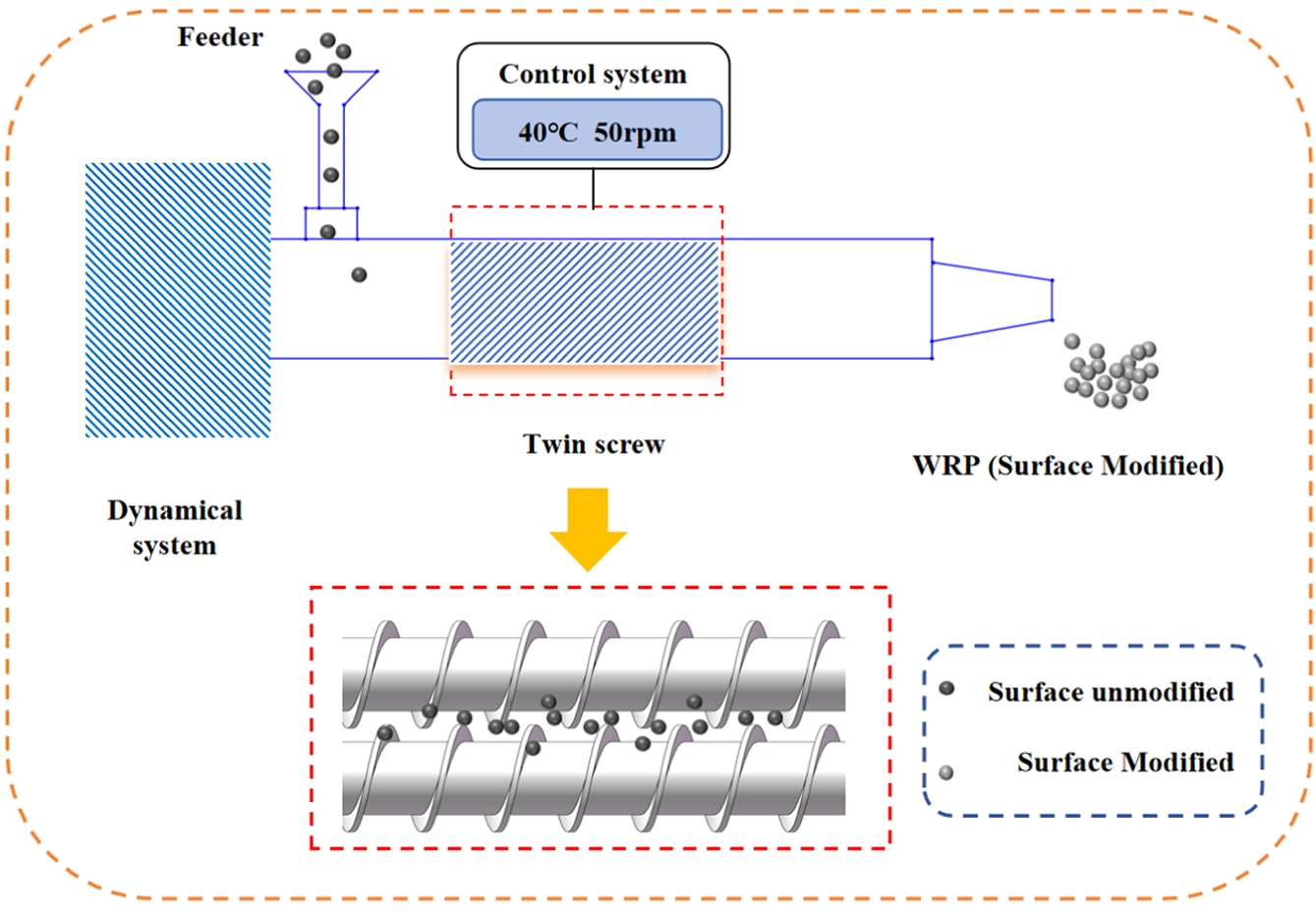 Based on the process diagram of WRP modification shown in Figure 1. Set the temperature of the twin-screw extruder to 160 ℃ and the main screw speed to 60 rpm. When the equipment reaches the set working conditions, add the WRP to the feeding port and pass it through the twin-screw extruder 0 times, 1 time, 2 times, 3 times, and 4 times, denoted as WRP-0, WRP-1, WRP-2, WRP-3, and WRP-4, respectively.
