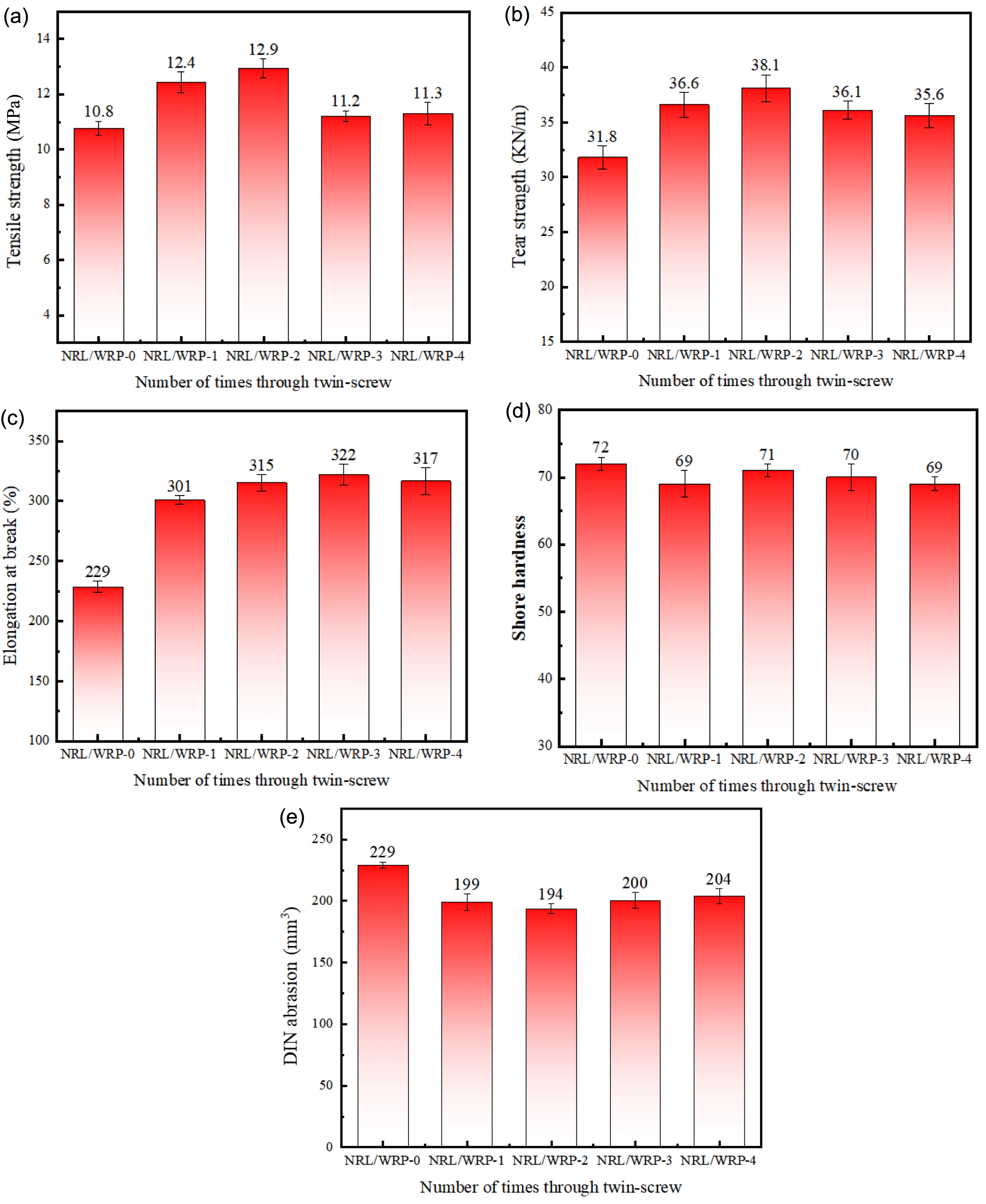 Mechanical properties of NRL/WRP composites: (a) tensile strength; (b) tear strength; (c) elongation at break; (d) shore hardness; (e) DIN abrasion.