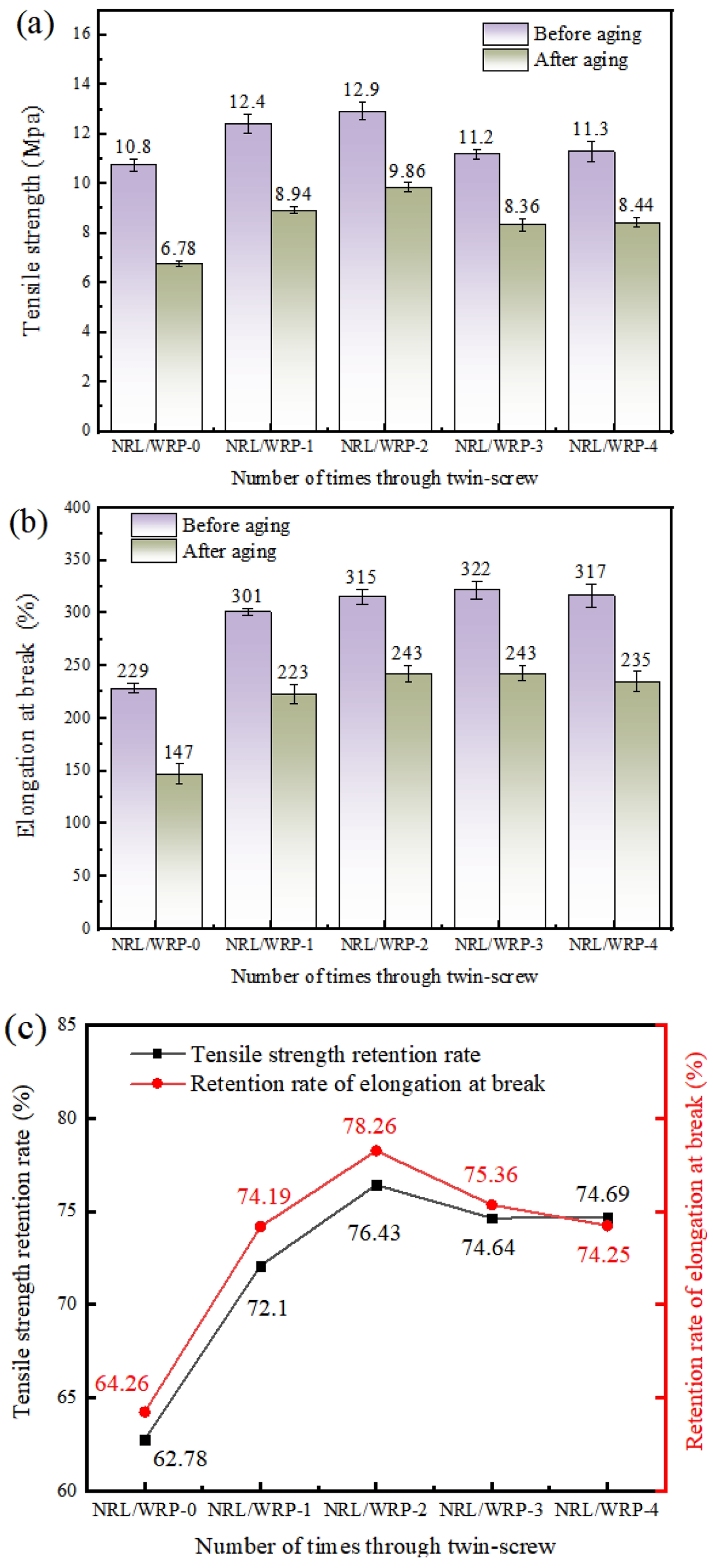 Aging performance of NRL/WRP composites: (a) tensile aging chart; (b) elongation at break aging chart; (c) tensile strength and elongation at break retention rate.