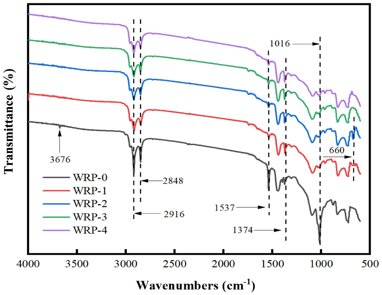Analysis of Twin-Screw Extruded WRP. As shown in Figure 8, only WRP-0 exhibits a very weak peak at 3676 cm-1. This is attributed to other impurities (such as certain oxides) present in the original rubber powder, resulting in a faint absorption peak. At 2916 cm-1 and 2848 cm-1, all five rubber powder samples exhibit identical absorption peaks.32