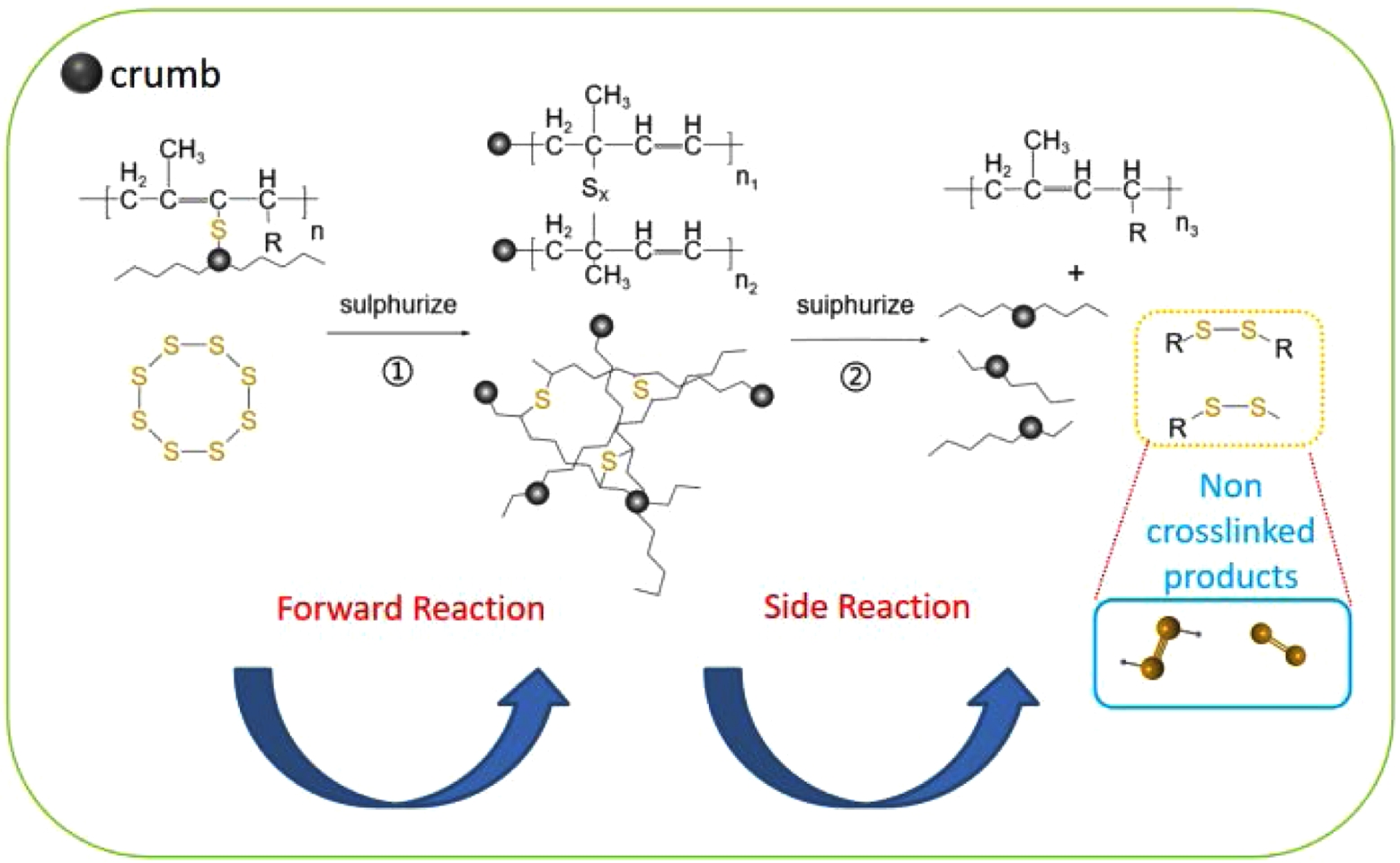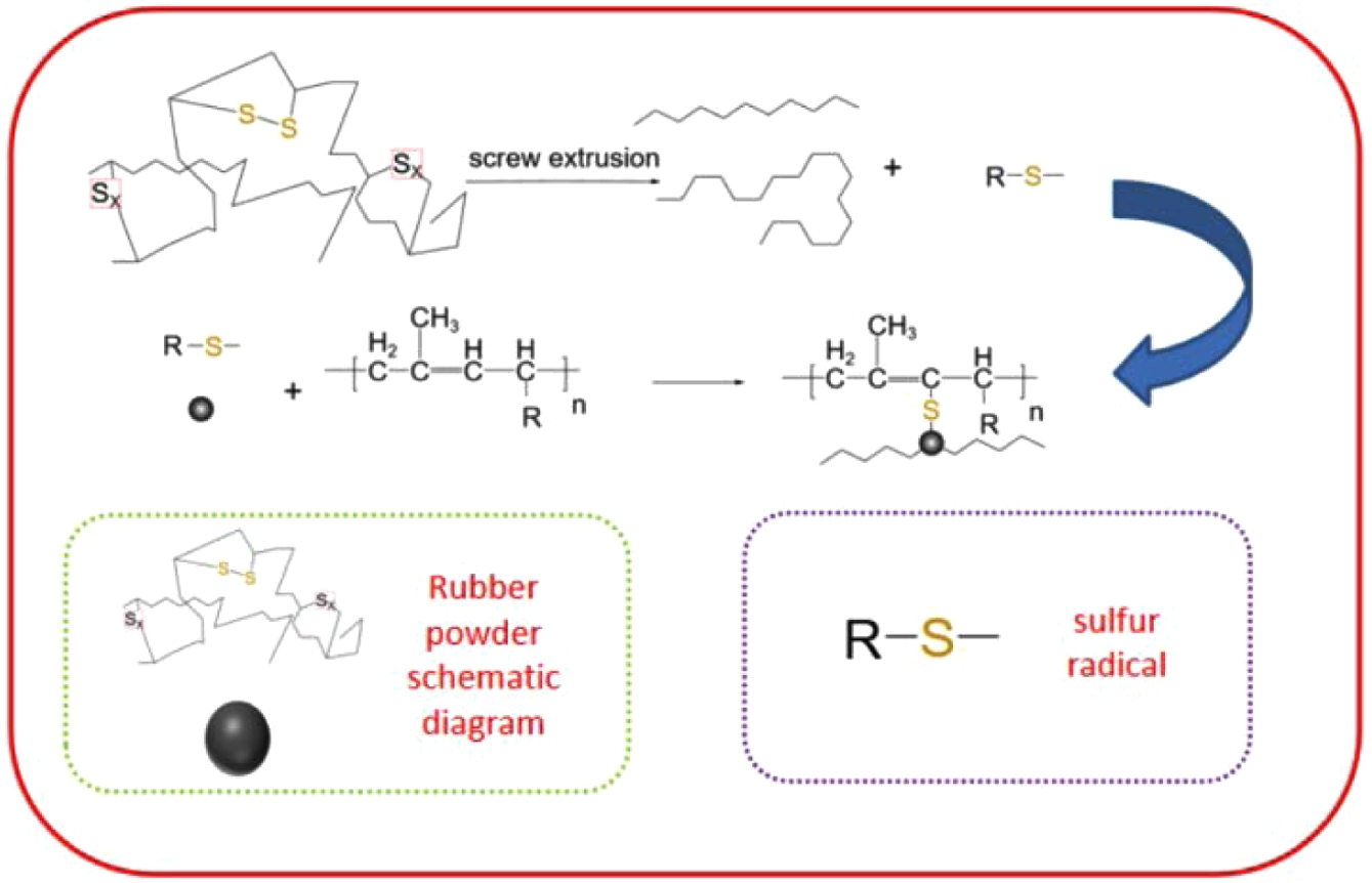 As shown in Figure 9: During the screw extrusion process, the WRP is subjected to the combined effects of mechanical shear, high temperature, and friction, resulting in the breakage of polysulfide bonds (- S-S -)37 and the generation of sulfur free radicals (R-S).38 These free radicals have high reactivity and are important active substances involved in crosslinking reactions during the subsequent sulfurization stage.