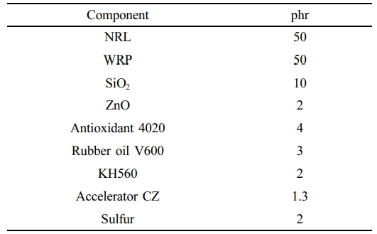 Materials. NRL: Qingjinreina Rubber Technology Co., Ltd. SiO2: Shandong Lianke Technology Co., Ltd. Zinc oxide (indirect method) (ZnO): Weifang Longda Zinc Industry Co., Ltd. Stearic acid (SA): Shandong Shangshun Chemical Co., Ltd. Antioxidant 4020: Shengao Chemical Technology Co., Ltd. Accelerator (CZ): Rongcheng Chemical Plant Co., Ltd. 3-Glycidoxypropyltrimethoxysilane‌ (KH-560): Zhongjie New Materials Co., Ltd. WRP: Daqing Haoyue Rubber Manufacturing Co., Ltd. Oil V600: Shandong Taichang Petrochemical Technology Co., Ltd. Deionized water: homemade.