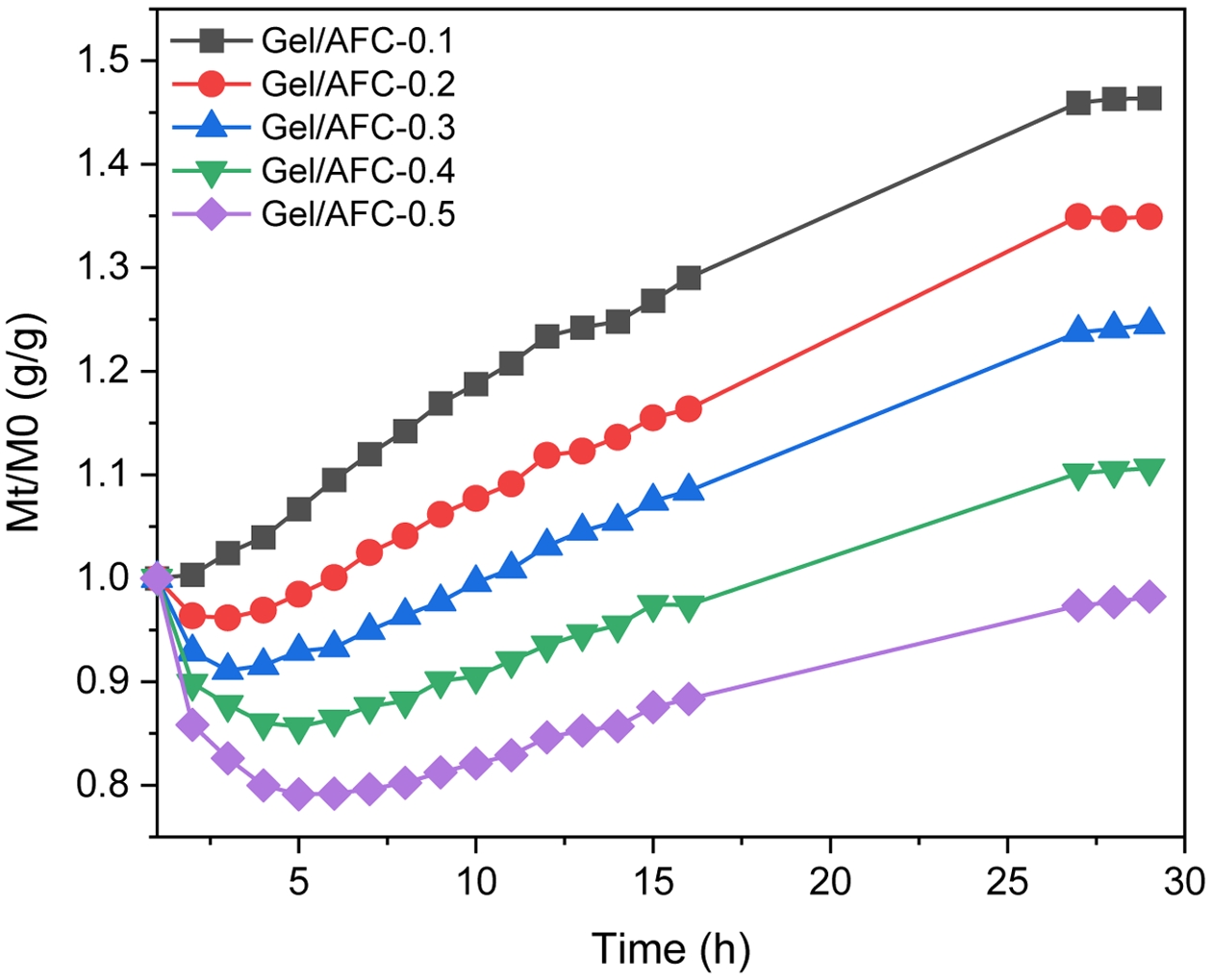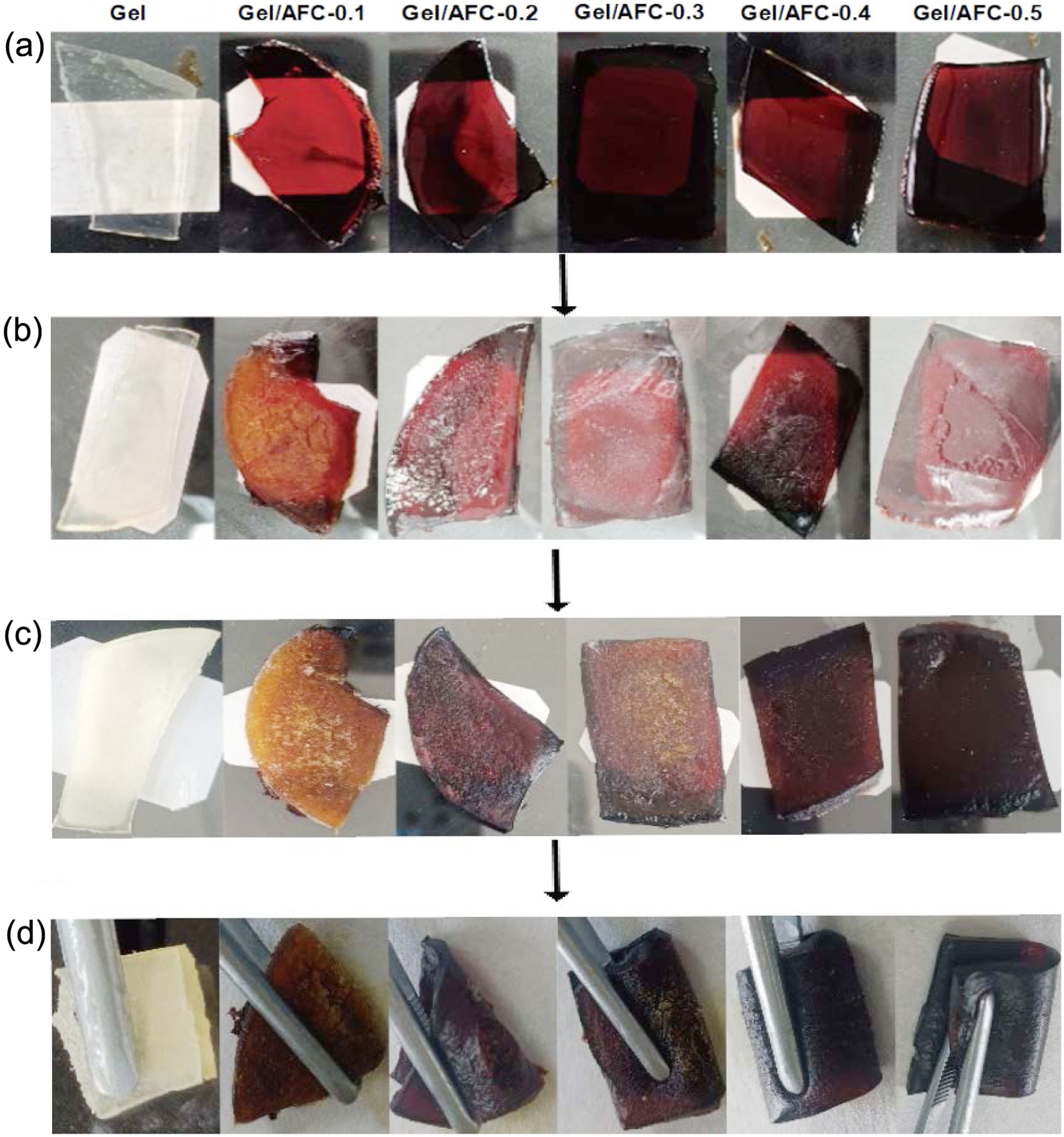 The component content of Gel/AFC-x hydrogels is displayed in Table 1. With an increase in the concentration of immersion solutions, the AFC content of hydrogels increased continuously and the gelatin content showed a similar change. On the contrary, the water content decreased with an increase of AFC solution concentration. This may be due to the absorption and swelling of the AFC solution. Similar results have been observed in the immersion of gelatin hydrogels in K3Cit solutions.20