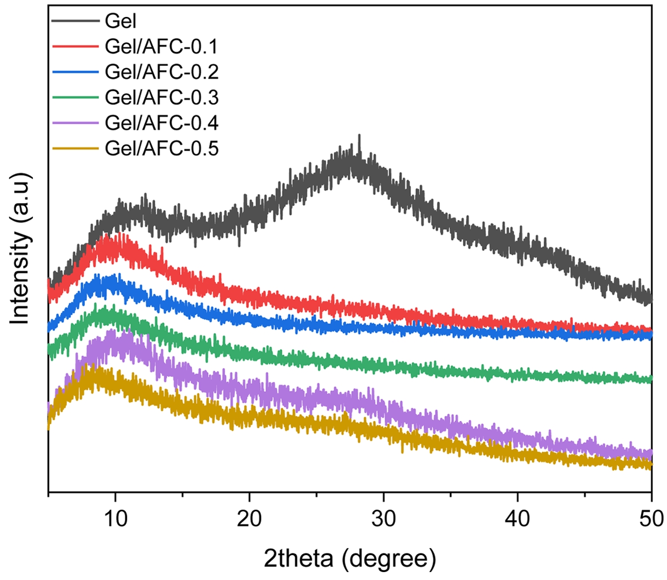 Structure of Gel/AFC-x Composite Hydrogels. To explore the influence of salt concentration on the microstructure of Gel/AFC-x composite hydrogels, a wide-angle X-ray diffraction (WAXD) experiment was conducted and the result was displayed in Figure 4. It can be observed that two broad peaks appear at 2θ = 11° and 27° for pristine gelatin hydrogels. The former can be attributed to the ordered triple helix structure, while the latter is related to the random coils of protein molecules.36 In general, the broad diffraction peak at 2θ = 11° indicates a low periodicity in the lateral stack of the triple helices in the hydrogels. This can be explained by the fact that a large number of water molecules existing in the hydrogels can penetrate into the triple helices, causing them to move away from each other and reducing the crystallinity of gelatin hydrogels.