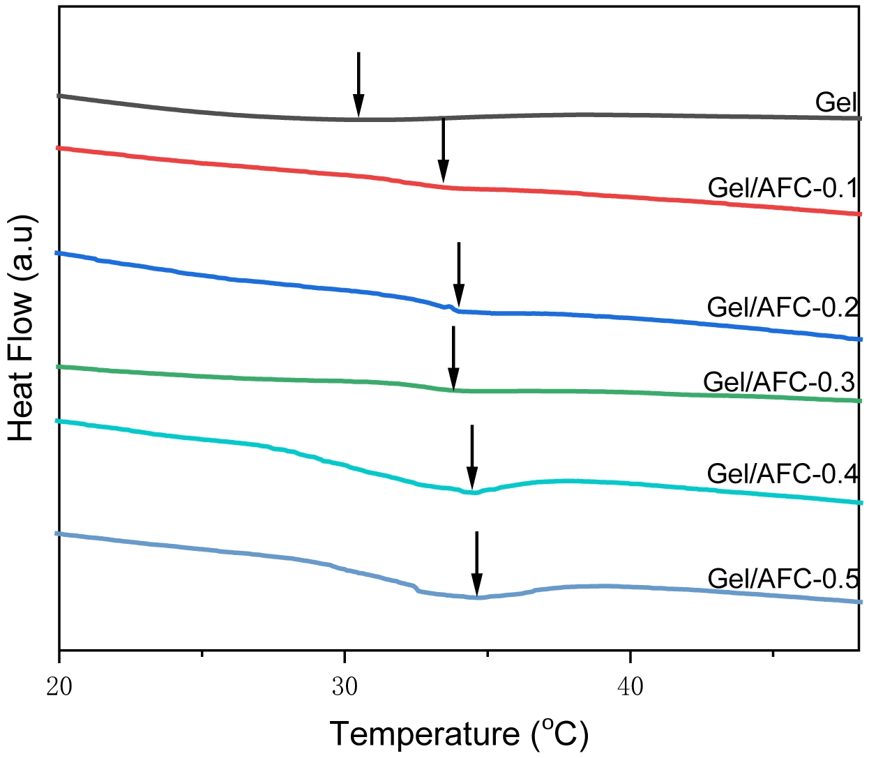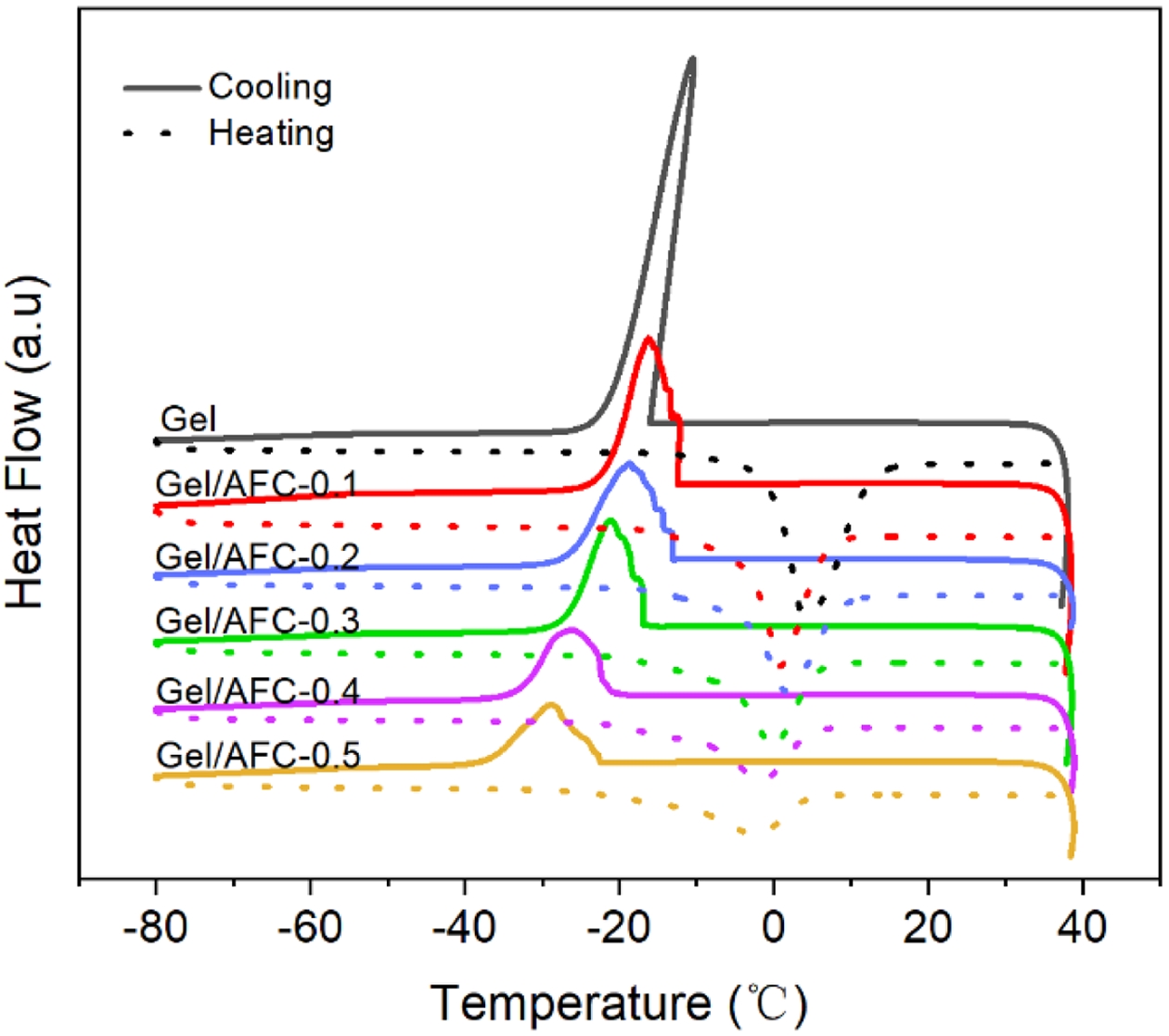 To further evaluate the anti-freezing performances of hydrogels, DSC experiments were carried out and the result was displayed in Figure 8. It is observed that a significant exothermic peak appeared at -10.52 ℃ for the pristine gelatin hydrogel, which is caused by the freezing transition of water molecules existed in the hydrogels. After soaking in AFC solutions, this exothermic peak moved to low temperatures and the freezing point decreased gradually with an increase in AFC content. For instance, the freezing temperature decreased from -16.85 ℃ for Gel/AFC-0.1 to -29.85 ℃ for Gel/AFC-0.5. This result indicates that the introduction of ammonium iron citrate endows hydrogels with good frost resistance. It can be explained by the fact that the introduction of strongly hydrated ions (citrate and ammonium ions) destroys the hydrogen bonds between water molecules. As a result, the formation of ice crystals is hampered, resulting in a decrease in the freezing point. This enhancement of frost resistance has been reported previously by Qin et al.23 for the gelatin hydrogels soaked in sodium citrate solutions. Noteworthy, the freezing-transition peak broadened and weakened with an increase in AFC content. The former was attributed to the obstruction of ice crystal formation owing to the destruction of hydrogen bonds between water molecules, while the latter is associated with a reduction of water content due to the dehydration of gelatin molecules. A similar result was observed for the gelatin-DES hydrogel system.36