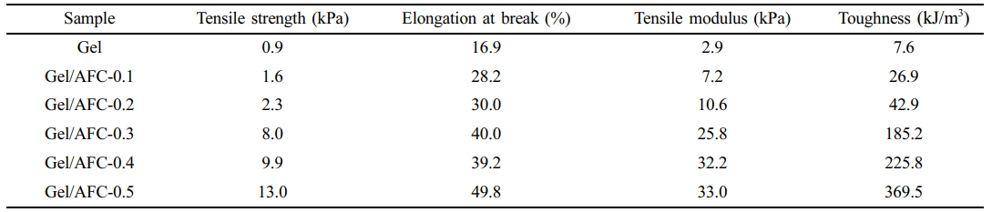 In addition to triple helices, the ferric ions also function as crosslinks between the gelatin chains due to the coordination of Fe3+ with gelatin, resulting in enhanced mechanical strength of hydrogels. This interchain metal-ligand interaction has been previously investigated in relation to its influence on the mechanical properties of protein-based hydrogels.29,46 Moreover, an increase in the triple-helix content could improve the toughness of the gelatin hydrogels.47 Thus the elongation at break of composite hydrogels also increases with an increase in AFC content. In addition, both the tensile modulus and toughness increased with an increase in AFC content. These observations indicate that both the strength and toughness of hydrogels can be simultaneously enhanced by soaking treatment.