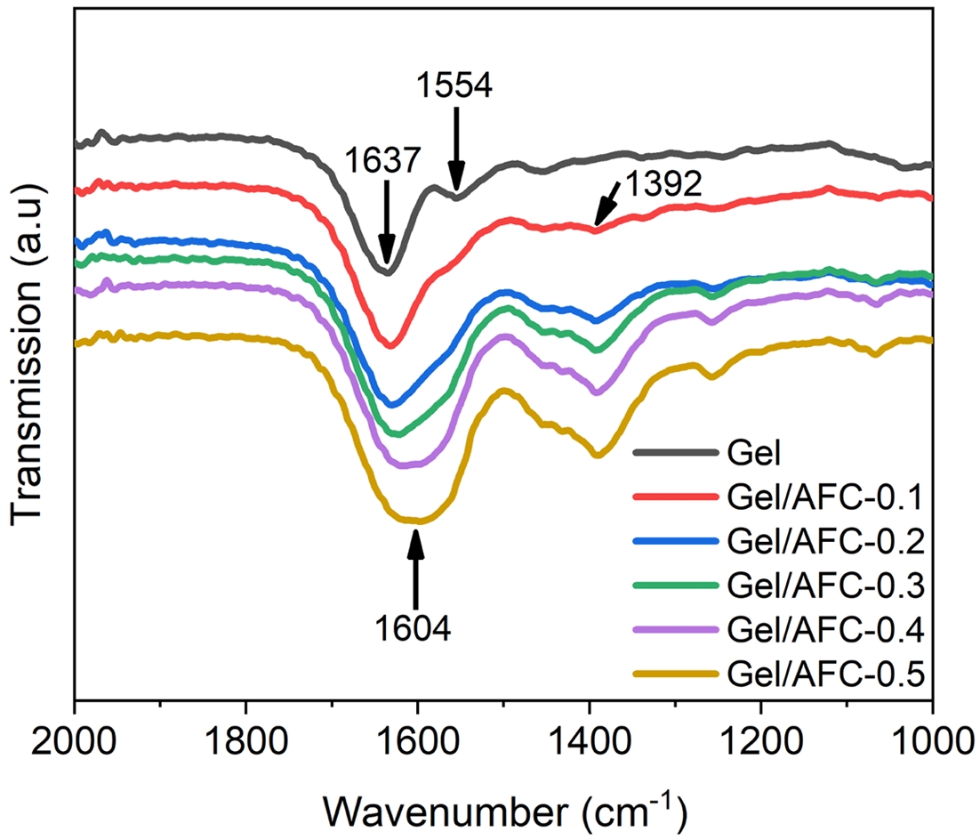 Noteworthy, all the composite hydrogels showed an obvious absorption peak at 1392 cm-1, attributing to the bending vibration of C-H groups and the symmetric deformation vibration of -CH3 groups.20 Additionally, the intensity of this peak gradually increases with an increase in AFC content. This result strongly suggests an enhancement of hydrophobic interactions between gelatin chains, which is induced by the dehydration of gelatin molecules due to the strong hydration of citrate and ammonium ions. Similar observations have been reported previously by other researchers for gelatin-based hydrogels with the incorporation of strongly hydrated ions.1,21,23,24
