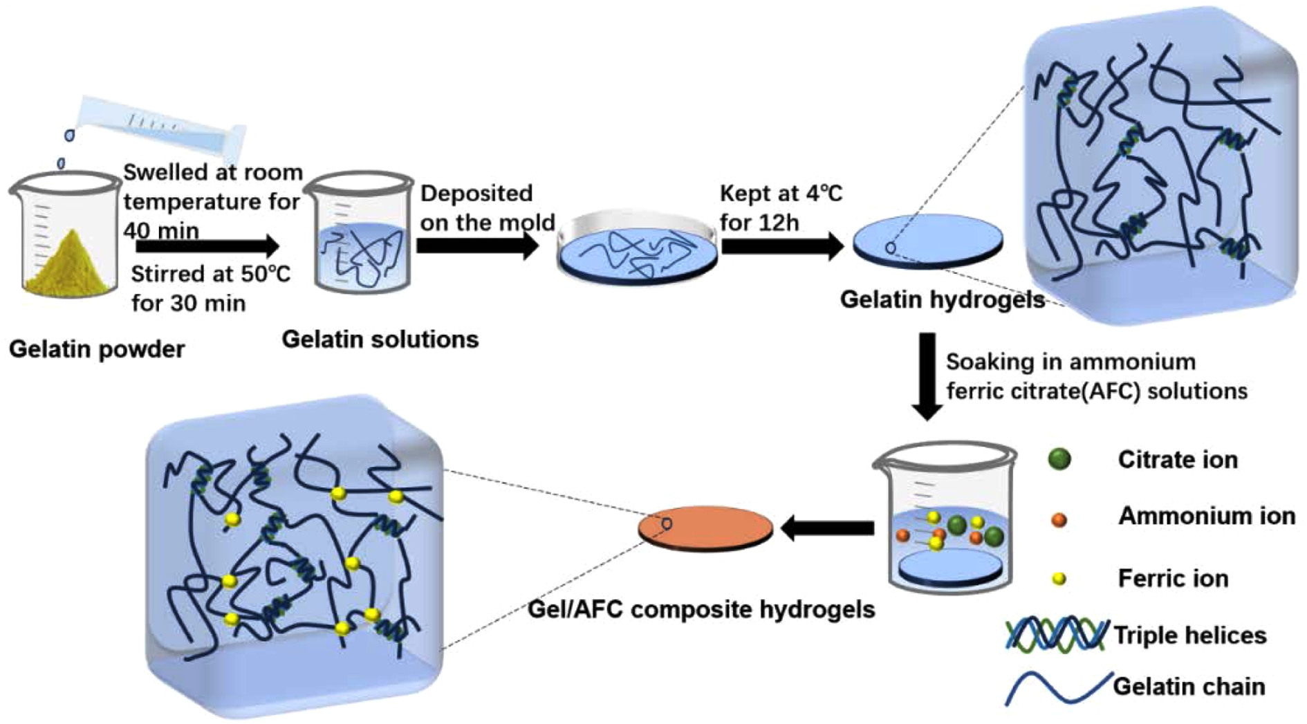 Preparation of Gelatin/ammonium Ferric Citrate (AFC) Composite Hydrogels. The gelatin/ammonium ferric citratecomposite hydrogels were fabricated by the soaking method. Briefly, a series of ammonium ferric citrate solutions with different concentrations of 0.1, 0.2, 0.3, 0.4, and 0.5 g/mL could be obtained by dissolving a certain amount of AFC in ultra-pure water. Then the original gelatin hydrogel was soaked in AFC solutions at various concentrations (0.1, 0.2, 0.3, 0.4, and 0.5 g/mL), afterwards, the immersed hydrogels were taken out, rinsed with ultra-pure water to remove surface residues and the gelatin/AFC hydrogels were formed. For convenience, the gelatin/AFC hydrogels are denoted as Gel/AFC-x, where Gel represents gelatin, AFC is ammonium ferric citrate, and x stands for the AFC concentration.
