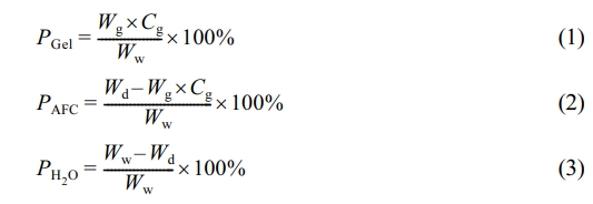 Characterization. The Composition of Gel/AFC-x Hydrogels: The gelatin content (PGel), AFC content (PAFC), and water content (PH2O) of Gel/AFC-x hydrogels were determined by Equations (1), (2) and (3), respectively, where Wg was the mass of pure gelatin hydrogel, Cg was the gelatin concentration (10 wt%). In addition, Ww and Wd were the masses of immersed hydrogels and corresponding dry gels (kept in a vacuum oven for 48 h at 60 ℃), respectively.
