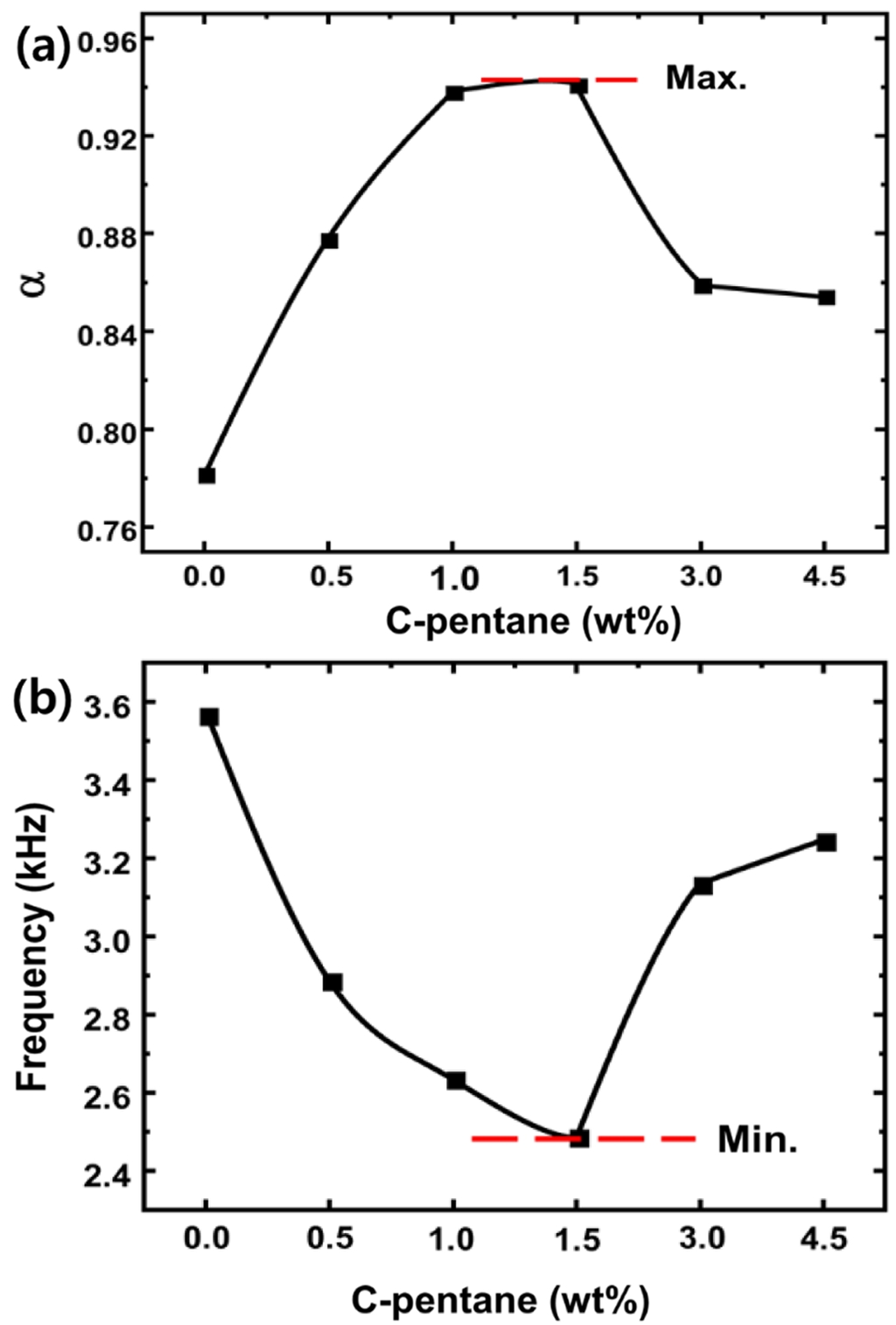 Optimization of the Cyclopentane Content in PU Composite Foams. In the application of cyclopentane as a co-blowing agent, determining the optimal cyclopentane content is important for achieving synergistic performance with a chemical blowing agent (water). Applying cyclopentane and melamine particles in manufacturing the PU composite foams is sequentially investigated for improving the sound absorption coefficient, and firstly the optimal amount of cyclopentane was examined by accessing the sound absorption coefficient.