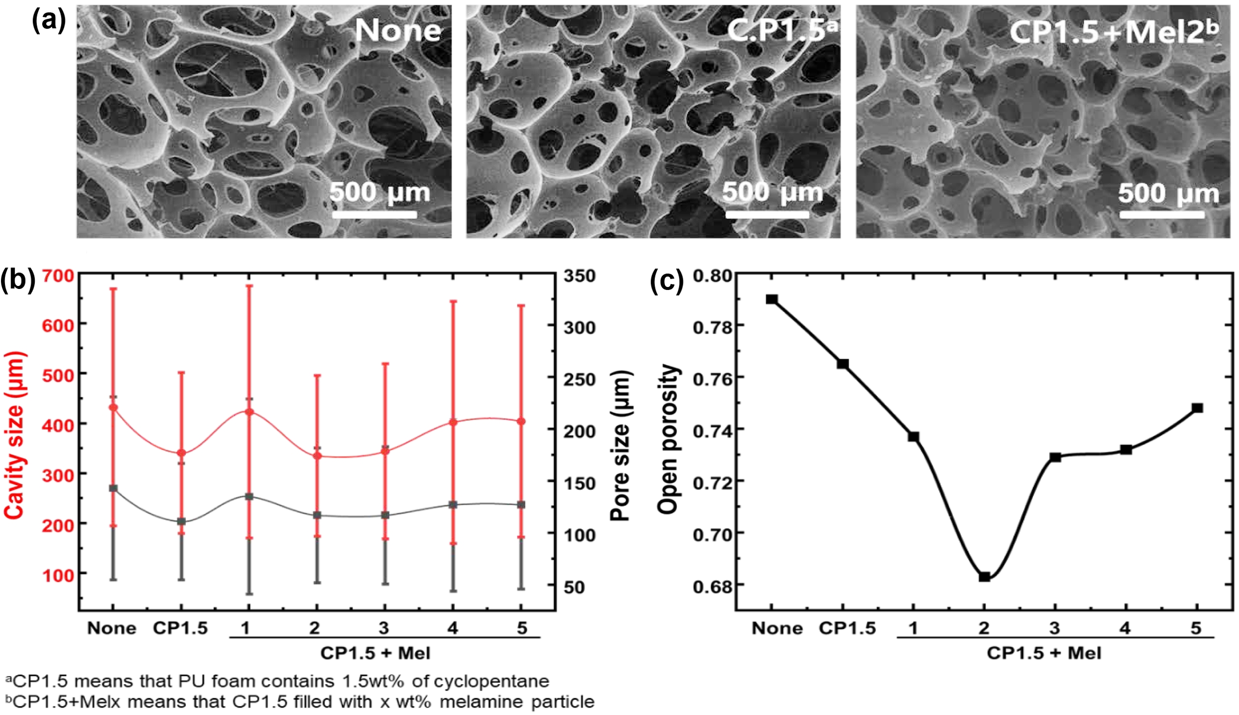 Figure 5 (a) Typical SEM images of the PU composite foams including melamine particles and cyclopentane with dispersant; (b) their pore size, cavity size; (c) open porosity. |