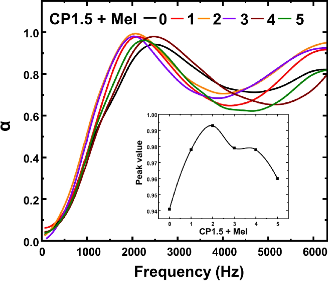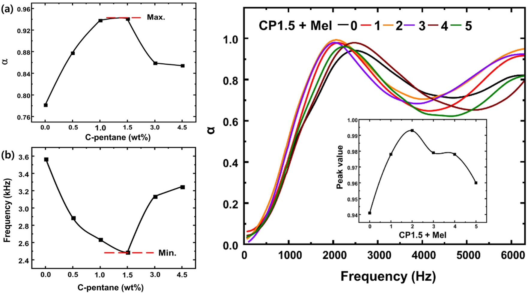 to the low-frequency range. Tortuosity is the actual path lengths (of air molecules through the foam) divided by the material thickness, and so it had the greatest effect at the 1/4 wavelength point. This is the point at which the sound path length through the tortuosity of the PU foam is one-fourth of the wavelength, where the incident and reflected waves meet in opposite phases and cause destructive interference, thereby maximizing the sound absorption performance.24,25 Therefore, the path of the reflected sound increases by half a wavelength due to tortuosity, leading to maximum energy dissipation. Consequently, the increased quarter-wavelength point causes the sound absorption peak to shift toward the low-frequency range. Figure 3 shows the sound absorption coefficients according to cyclopentane contents. As shown in Figure 3(a), the sound absorption coefficient (apeak value) increases up to 1.5 wt% and then decreases. This can be attributed to open porosity (Table 2) and airflow resistivity.16 It promotes reflections and scattering of sound waves in the foams, thereby enhancing sound energy dissipation. Therefore, when the cyclopentane content was 1.5 wt%, it was confirmed that the sample exhibited the smallest open porosity and the largest airflow resistivity. In addition, Figure 3(b) shows the lowest frequency of the maximum peak at 1.5 wt% of cyclopentane. This confirms that the highest tortuosity was achieved when 1.5 wt% of cyclopentane was added. Based on these observations, it can be understood that the best sound absorption characteristics are obtained when 1.5 wt% of the cyclopentane are used. Therefore, in the subsequent experiments for optimizing the contents of additional melamine particles, the cyclopentane was fixed at 1.5 wt%.