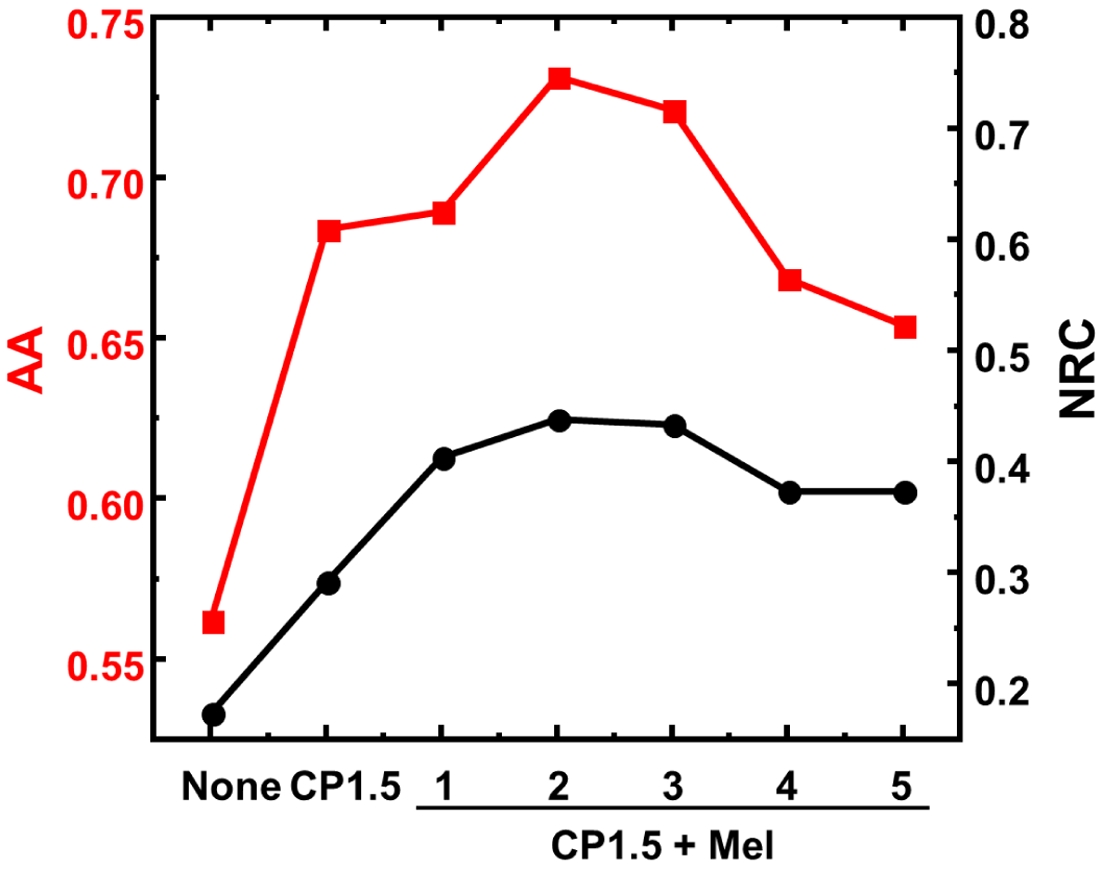 Sound Absorption Coefficient (a): To investigate the effect of melamine particles on the sound absorption coefficient, the sound absorption coefficient according to melamine particle contents was analyzed, as shown in Figure 6. It was confirmed that the sound absorption characteristics improved as the melamine particles increased. This trend showed the best sound absorption characteristics at 2 wt% and then gradually decreased. A similar trend can be observed in the change in open porosity shown in Figure 5(c). This is because the sound absorption characteristics of PU foams are considerably affected by the internal morphology.16 As the open porosity decreases, the possibility of sound waves hitting the cell walls increases, which can induce sound scattering or reflection. When 2 wt% melamine particles were added, it was confirmed that the maximum sound absorption coefficient was 0.993 due to the effects of air flow resistivity and open porosity. For further analysis, various indicators can be used to evaluate the acoustic characteristics. The samples were additionally analyzed by using acoustic activity (AA) and noise reduction coefficient (NRC). The AA was calculated as the average of the sound absorption coefficients in all frequency ranges, and the NRC was calculated as the average of the sound absorption coefficients at 250, 500, 1000, and 2000 Hz.31,32 As shown in Figure 7, it was found that the highest AA and NRC values were shown when 1.5 wt% of cyclopentane and 2 wt% of melamine particles were added together.