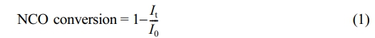 The normalized peak heights of the free NCO stretching band at the start of the reaction and at time t are denoted as I0 and It, respectively. The heights of the free NCO stretching band between 2270 and 2250 cm-1 were normalized using the internal standard peak at 2970 cm-1 (C-H stretching band) during polymerization20,21