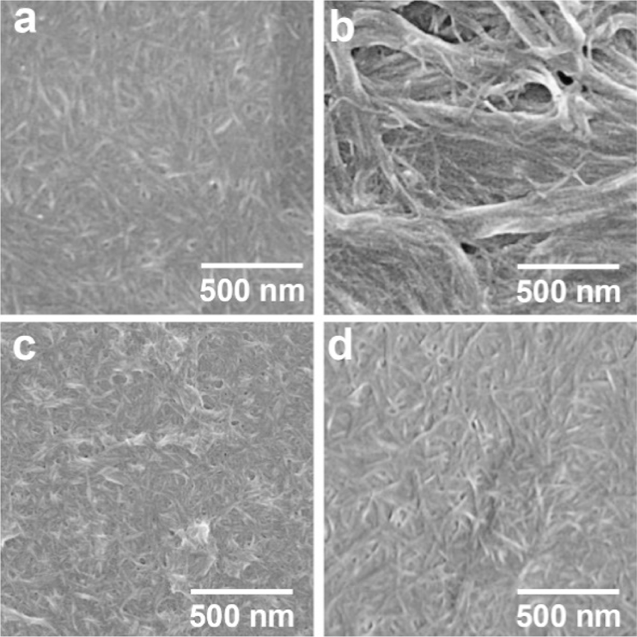 Figure 1 FE-SEM images of (a) CNC; (b) CNF; (c) APTES-CNC; (d) OTES-CNC. All the fillers were dispersed in H2O at a concentration of 0.5 wt%. |