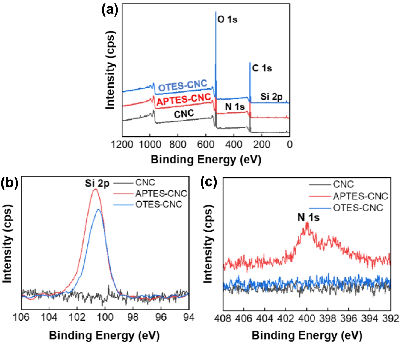XPS analysis was performed to compare the surface chemical structures of pristine and surface-modified CNCs. As shown in Figure 2(a), all samples exhibited characteristic peaks corresponding to C 1s (~285 eV) and O 1s (~533 eV). The high-resolution spectra (Figure 2(b)) further confirmed the presence of Si 2p peaks in the APTES-CNC (red line) and OTES-CNC (blue line), whereas the Si 2p signal was absent in the pristine CNC, indicating successful surface modification. Furthermore, a distinct N 1s signal observed only in APTES-CNC (Figure 2(c)), with peaks at 398.1 eV and 400.2 eV corresponding to NH2 and NH3⁺ groups, respectively, confirms the presence of amine functionalities introduced by APTES.35-41 The C 1s atomic concentration also increased upon silane functionalization. Specifically, the C 1s content increased from 54.1% in pristine CNC to 56.5% for APTES-CNC and 58.5% for OTES-CNC, respectively.