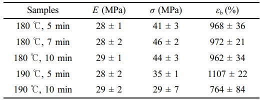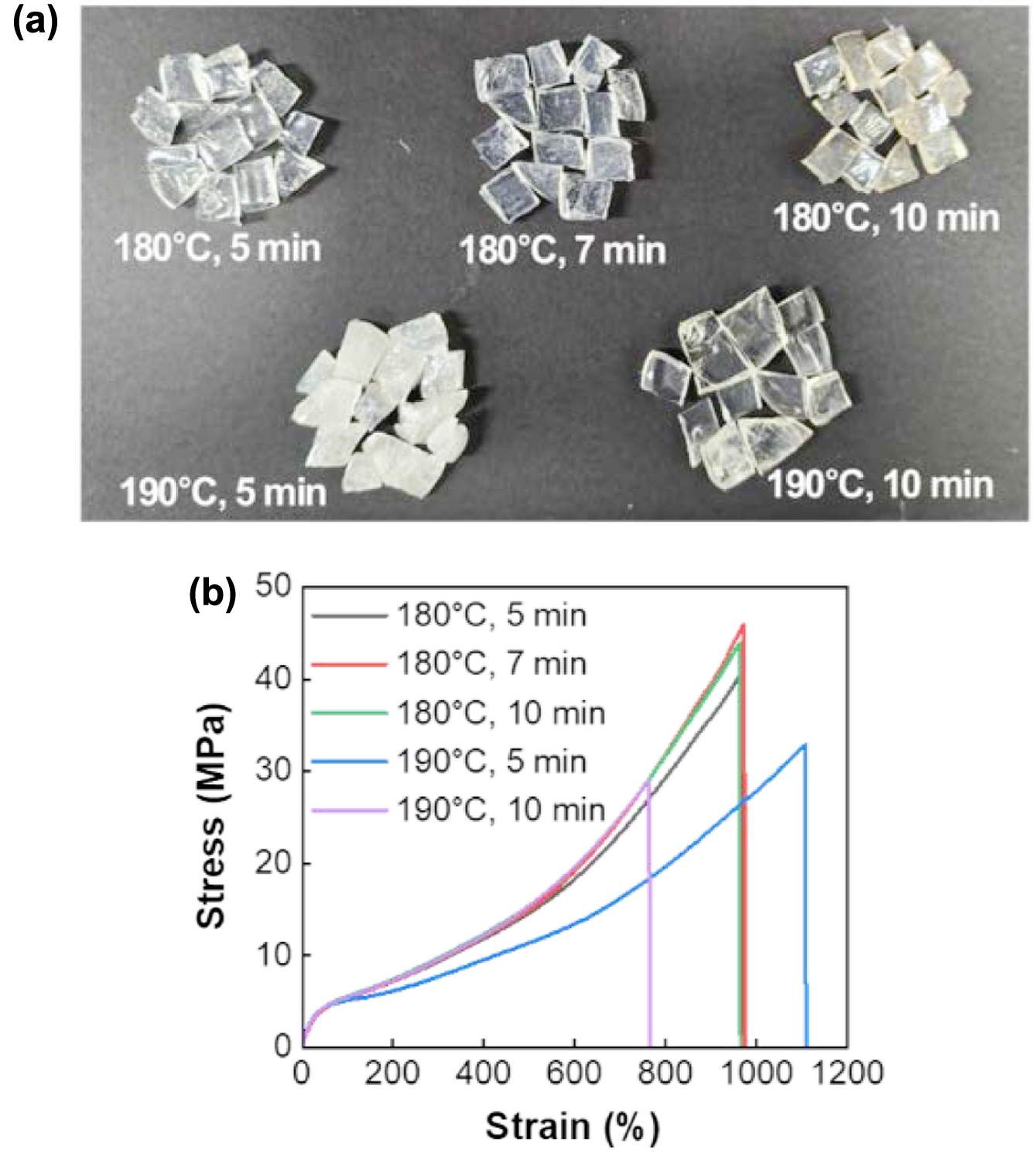 Figure 3 (a) Photographs of TPU processed under varying conditions; (b) their corresponding stress–strain behavior. |