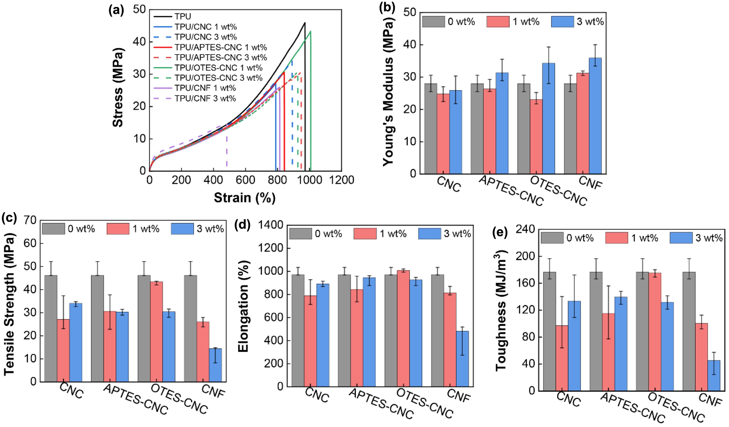 Figure 4 Mechanical properties of TPU/nanocellulose composites: (a) Representative mechanical profile (stress–strain curves); (b) Young’s modulus; (c) tensile strength; (d) elongation at break; (e) toughness. Nanocellulose contents are represented as gray (0 wt%), red (1 wt%), and blue (3 wt%). |