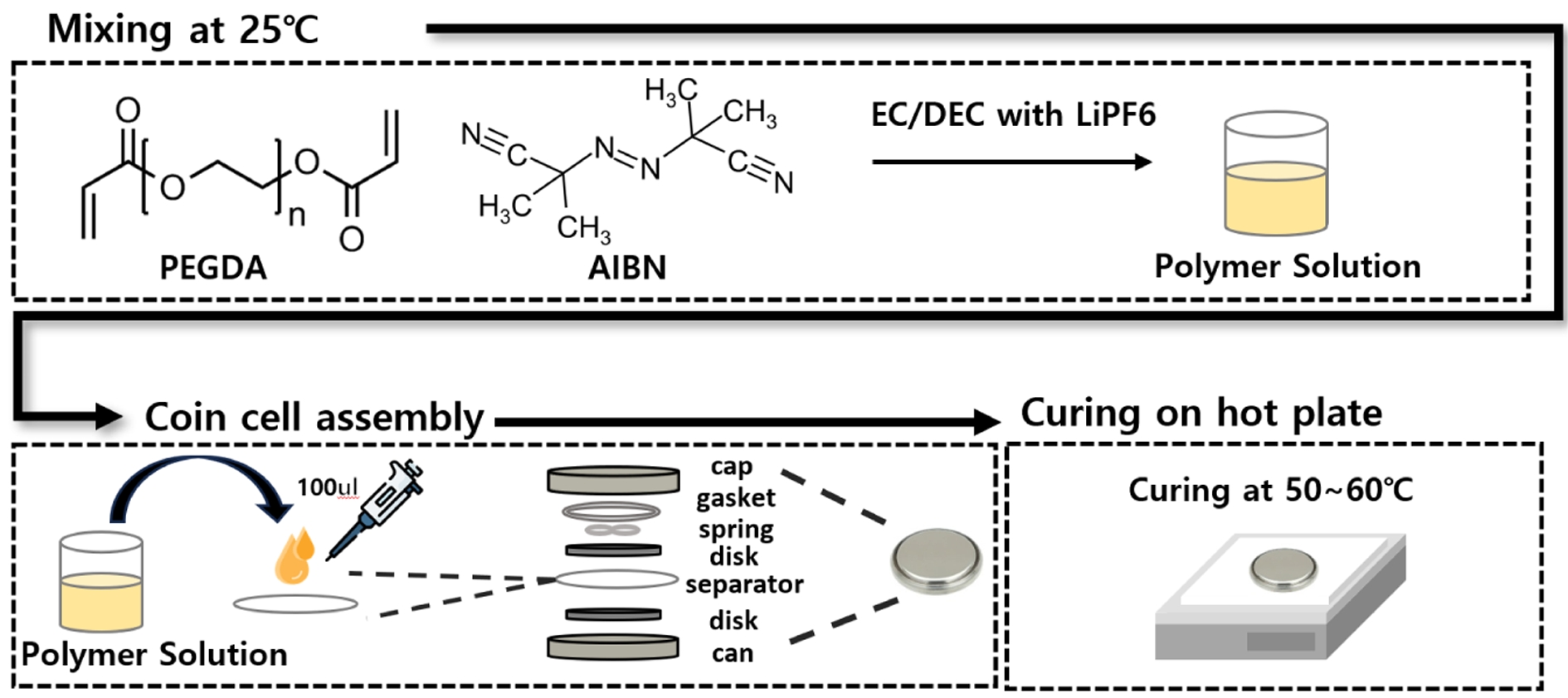 반고체 전해질 제조. 반고체 전해질은 다음의 공정에 따라 제조하였다(Figure 1). 먼저, 기본 전해액에 AIBN을 1.5 wt% 비율로 첨가한 후 자력 교반기를 이용하여 균일하게 혼합하였다. 이후 PEGDA를 각각 4 wt% 및 8 wt%의 비율로 첨가하고, 동일한 방식으로 추가 교반하여 전구체 용액을 제조하였다. 제조된 용액은 실리콘 몰드에 도포한 후, 50 ℃ 및 60 ℃에서 각각 1시간 또는 2시간 동안 열경화(thermal curing)를 수행하여 반고체 전해질 필름을 얻었다.
