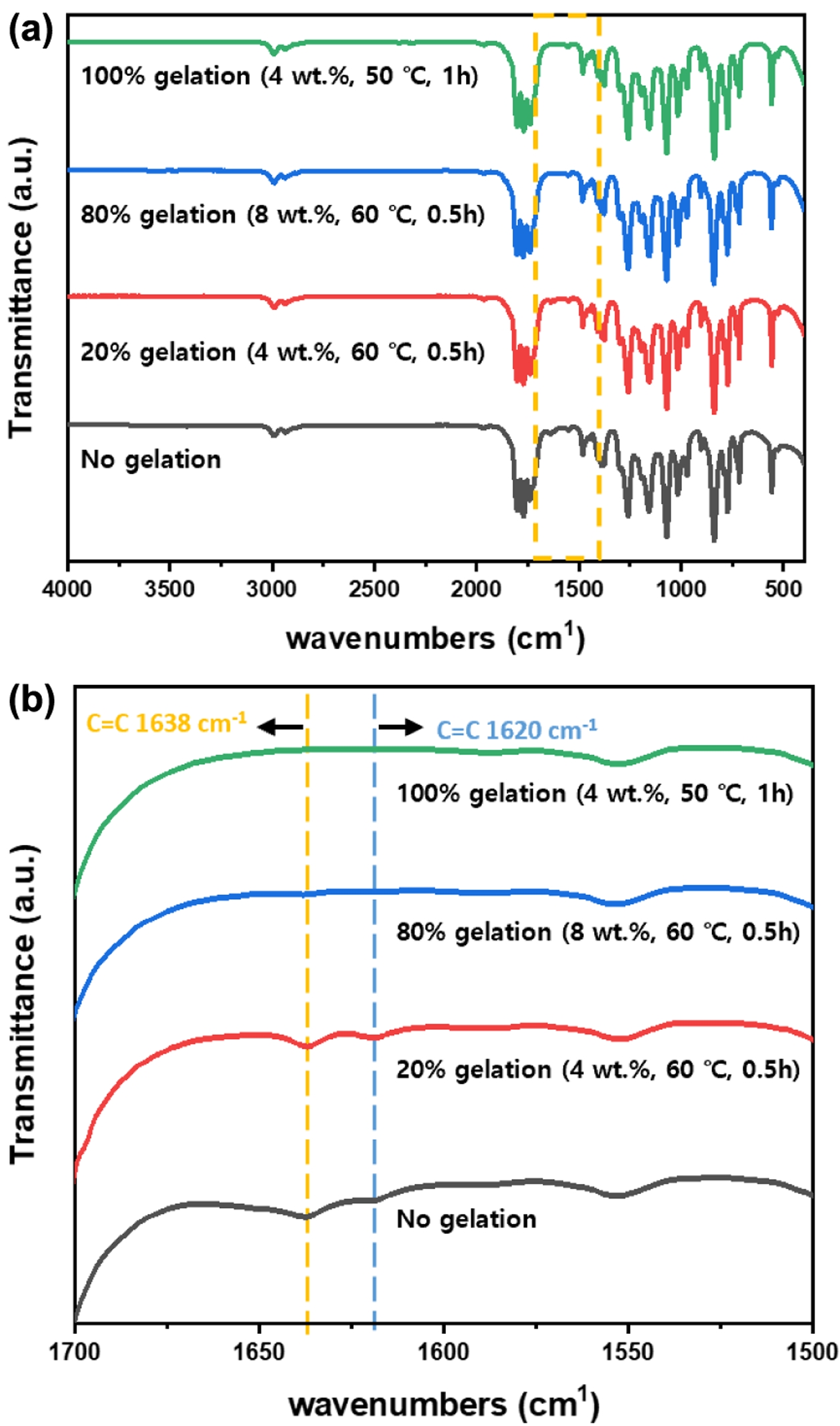 Figure 3 (a) Full ranged; (b) magnified FTIR spectra of the quasisolid electrolytes with varying the curing conditions. |