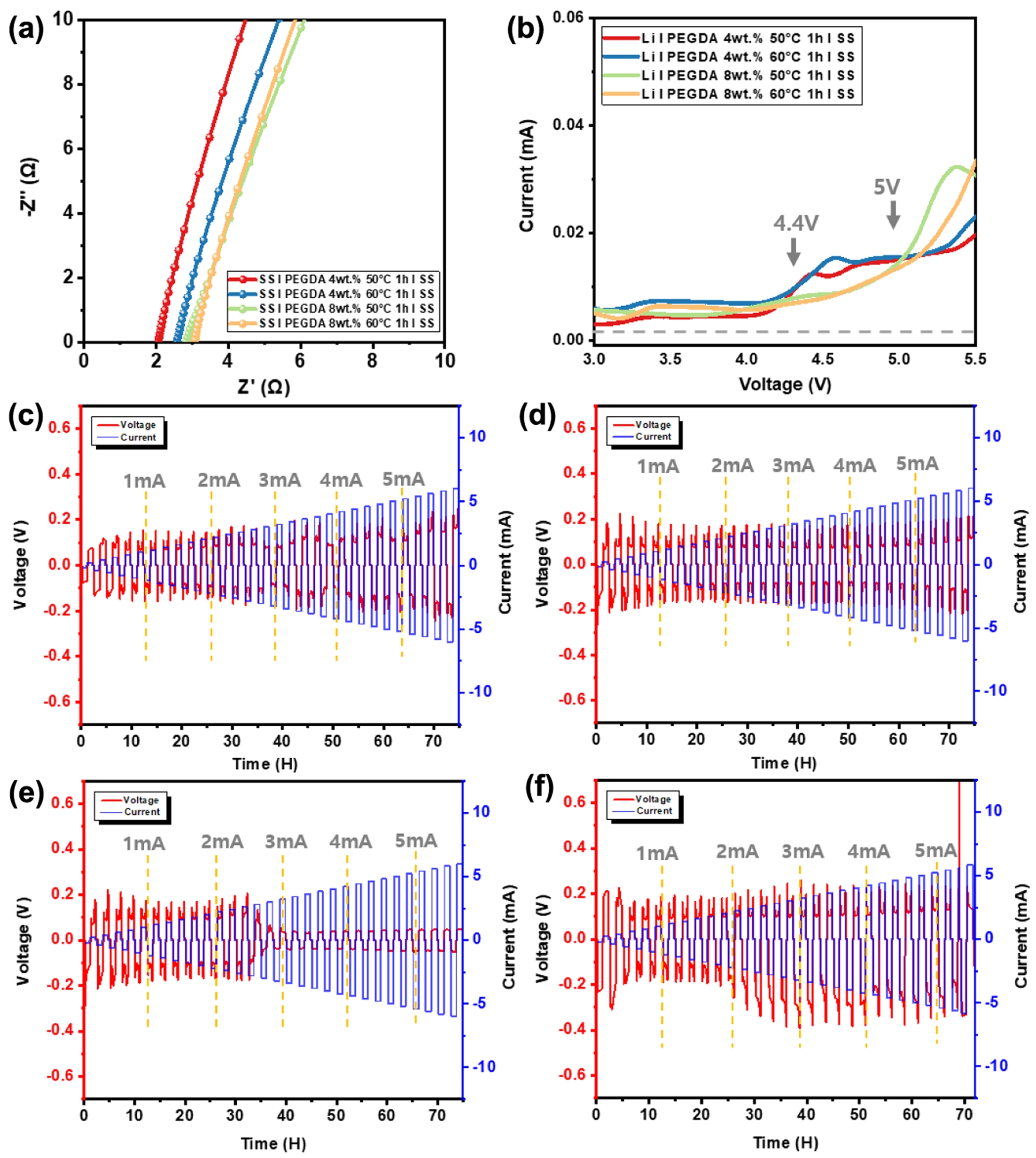 Figure 4 (a) Nyquist plot; (b) linear sweep voltammetry curves of the quasi-solid electrolytes with varying the curing conditions, voltage and current profiles in time domain of the quasi-solid electrolytes of (c) PEGDA 4 wt%, 50 ℃, 1 h; (d) PEGDA 4 wt%, 60 ℃, 1 h; (e) PEGDA 8 wt%, 50 ℃, 1 h; (f) PEGDA 8 wt%, 60 ℃, 1 h. |
