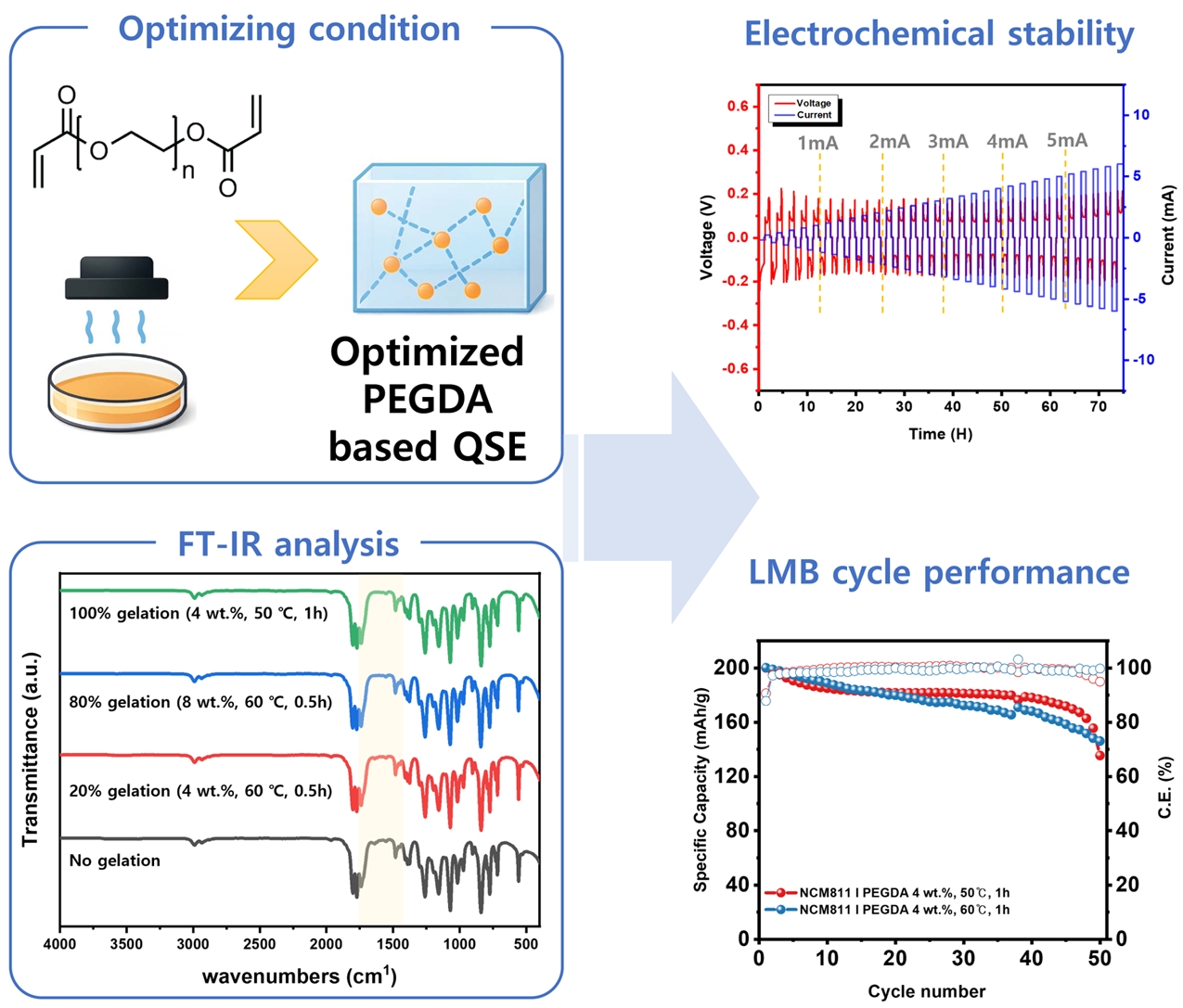 By optimizing the polymer content, curing temperature, and curing time of the poly(ethylene glycol) diacrylate (PEGDA)-based quasi-solid electrolyte (QSE), a high-performance QSE was fabricated, and its degree of curing was confirmed through Fourier-transform infrared (FTIR) analysis. The fabricated QSE exhibits excellent performance in electrochemical evaluations.