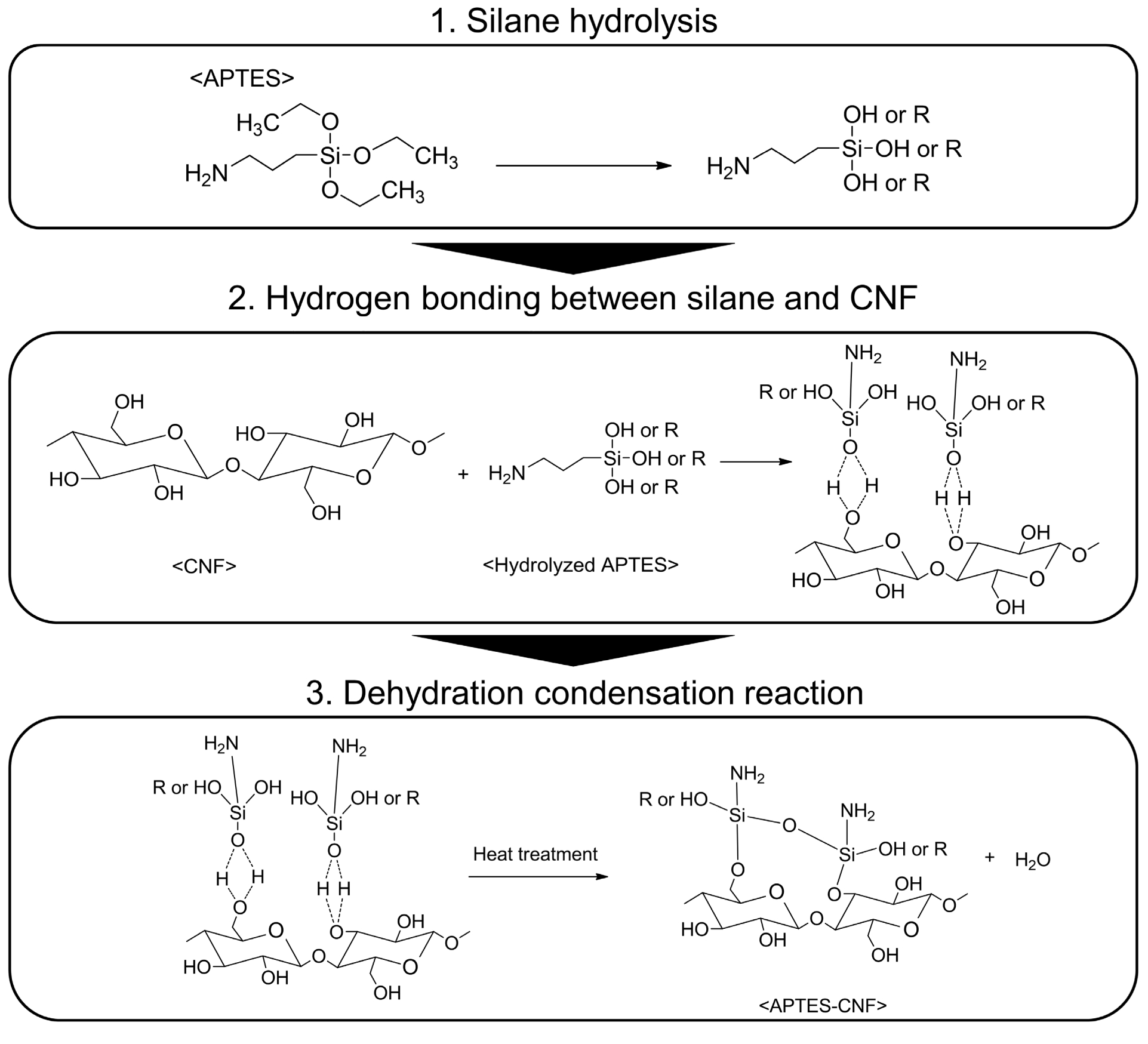 APTES를 이용한 CNF 표면 개질 모식도는 아래 Figure 1에 나타내었다.